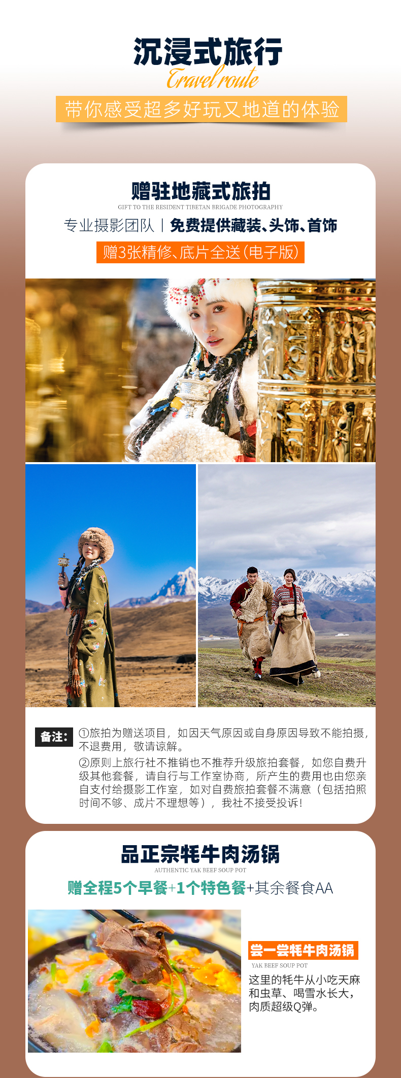1、驻地藏式旅拍1次(免费提供藏装/首饰/头饰,赠3张电子版简修,底片全送);