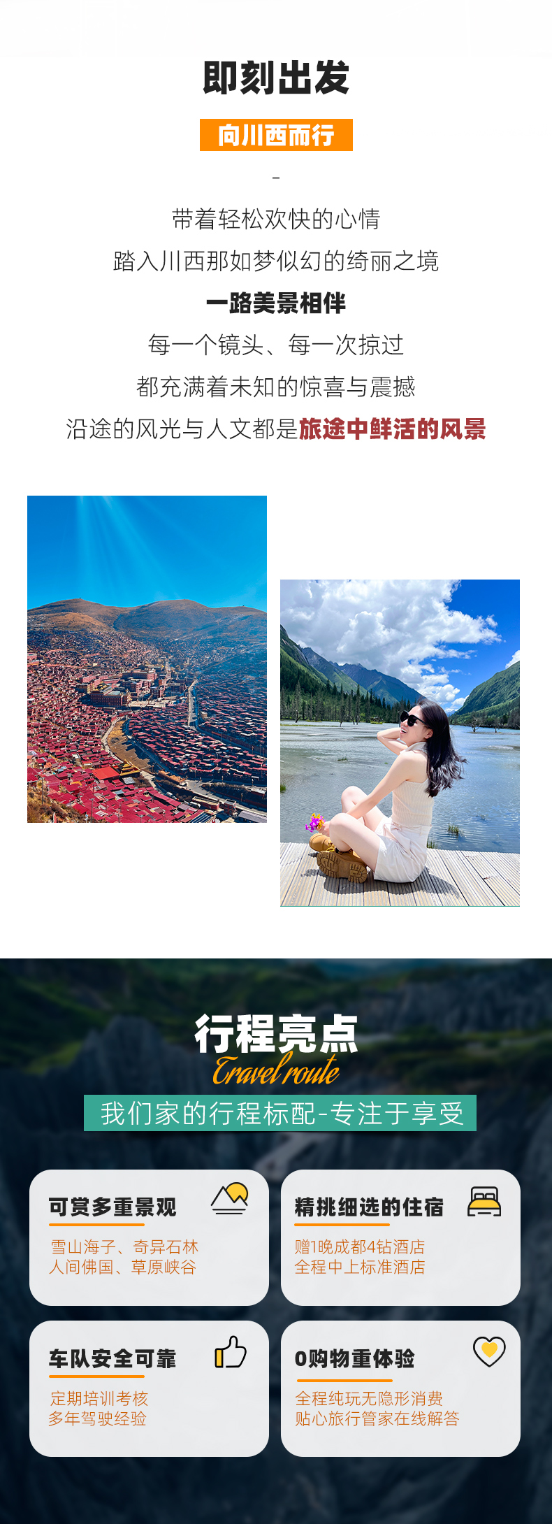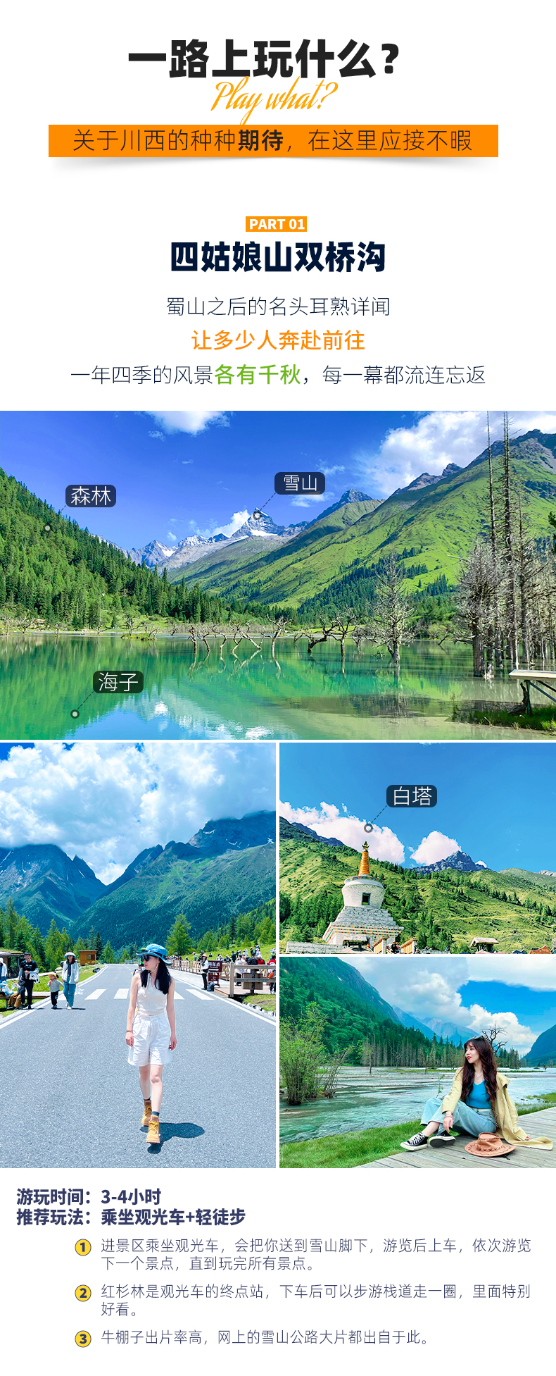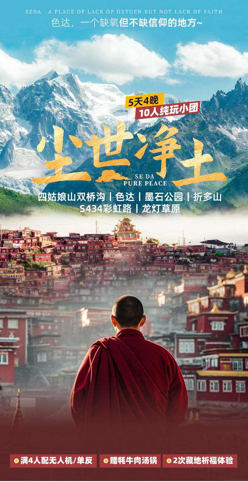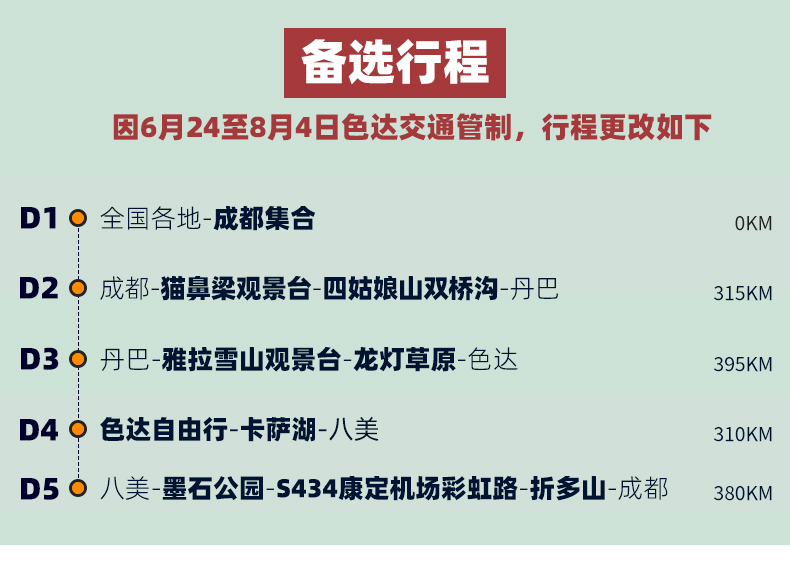 4、门票:四姑娘山双桥沟观光车70元/人(必须),墨石公园观光车20元/人(必须),色达预约48元/人,报名后请根据自己的游玩日期自行预约;