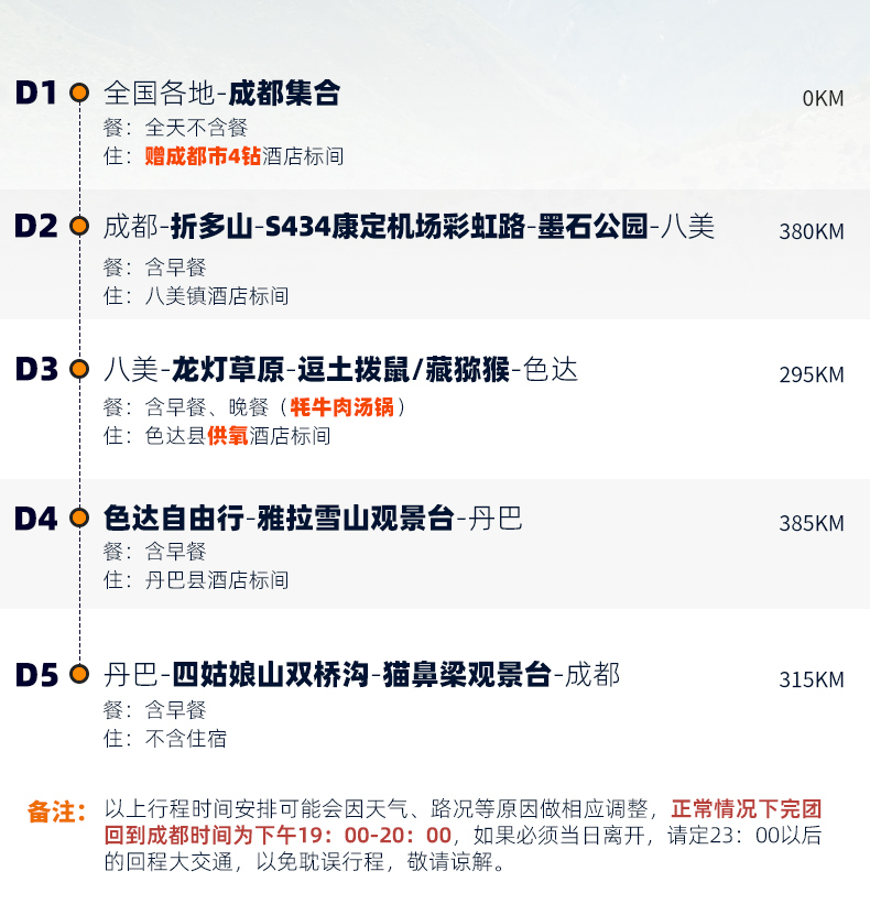 (2)川西沿途用餐以川菜为主,但因为路况原因,很多时间不能正点用餐,请自备干粮。