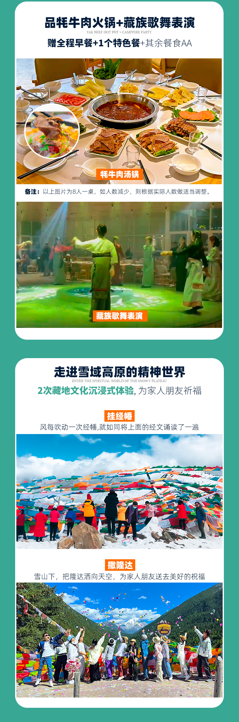 2、藏地人文体验:挂经幡、撒隆达、藏族歌舞表演(6人及以上赠送);