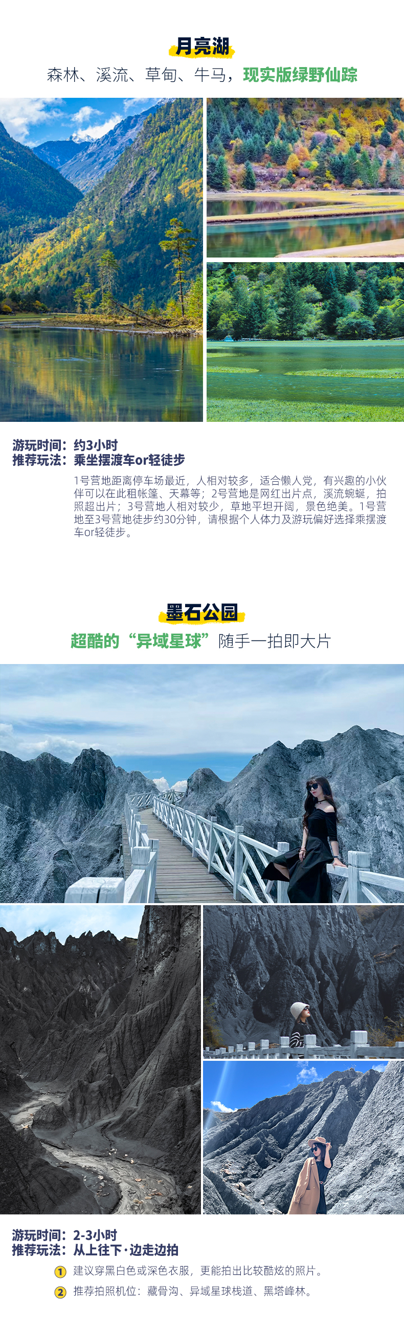 4、景交:四姑娘山双桥沟观光车70元/人(必须),墨石公园观光车20元/人(必须),月亮湖摆渡车60元/人(可选)、月亮湖清洁费25元/人(必须),鱼子西、红海子等清洁费10-30元/人暂未收取,如产生需自理。