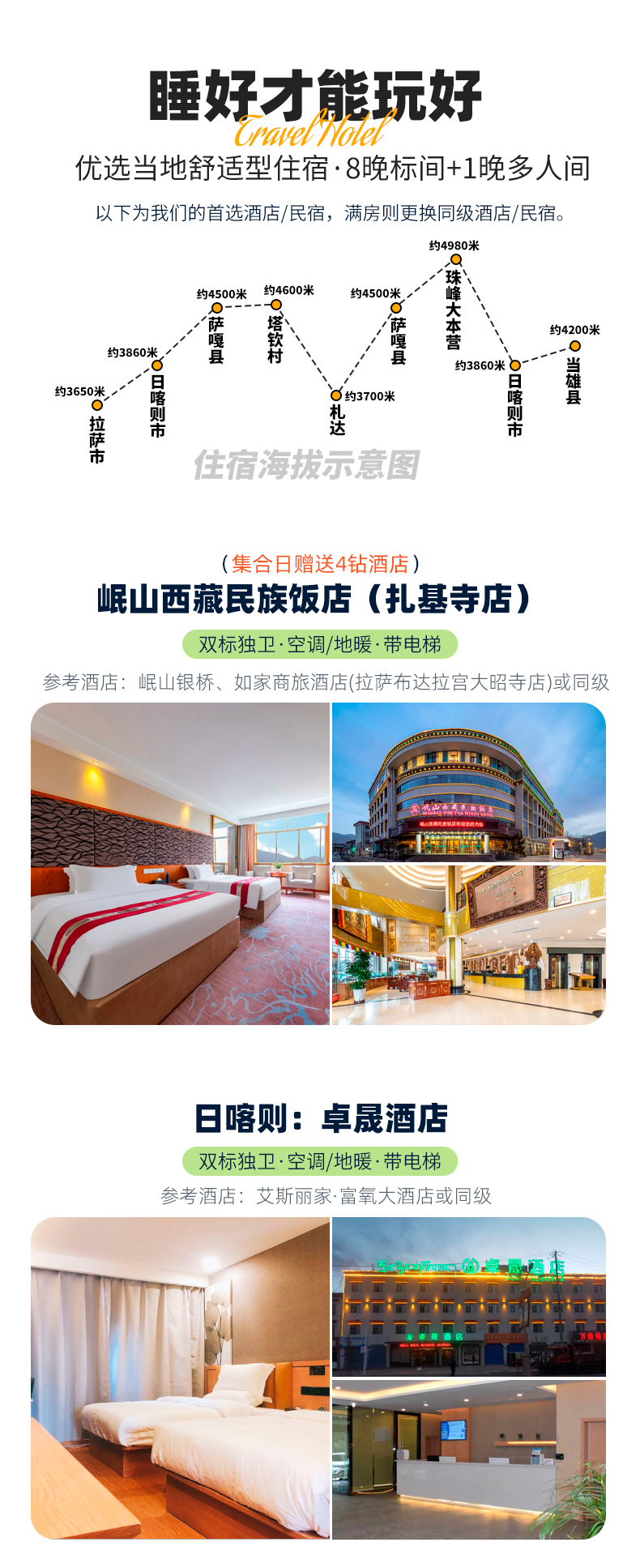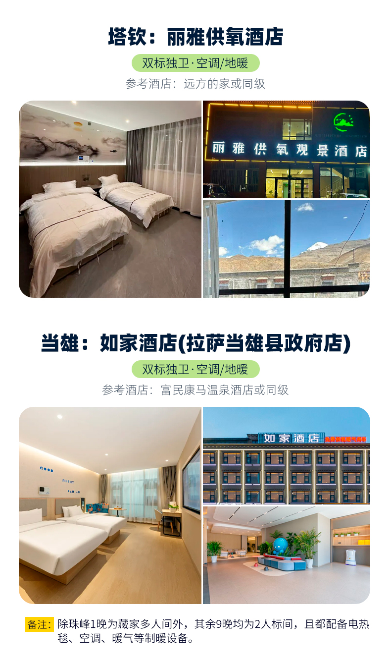 2、住宿:全程9晚住宿(8晚标间+1晚珠峰帐篷多人间,含集合日1晚赠送酒店、不住不退);