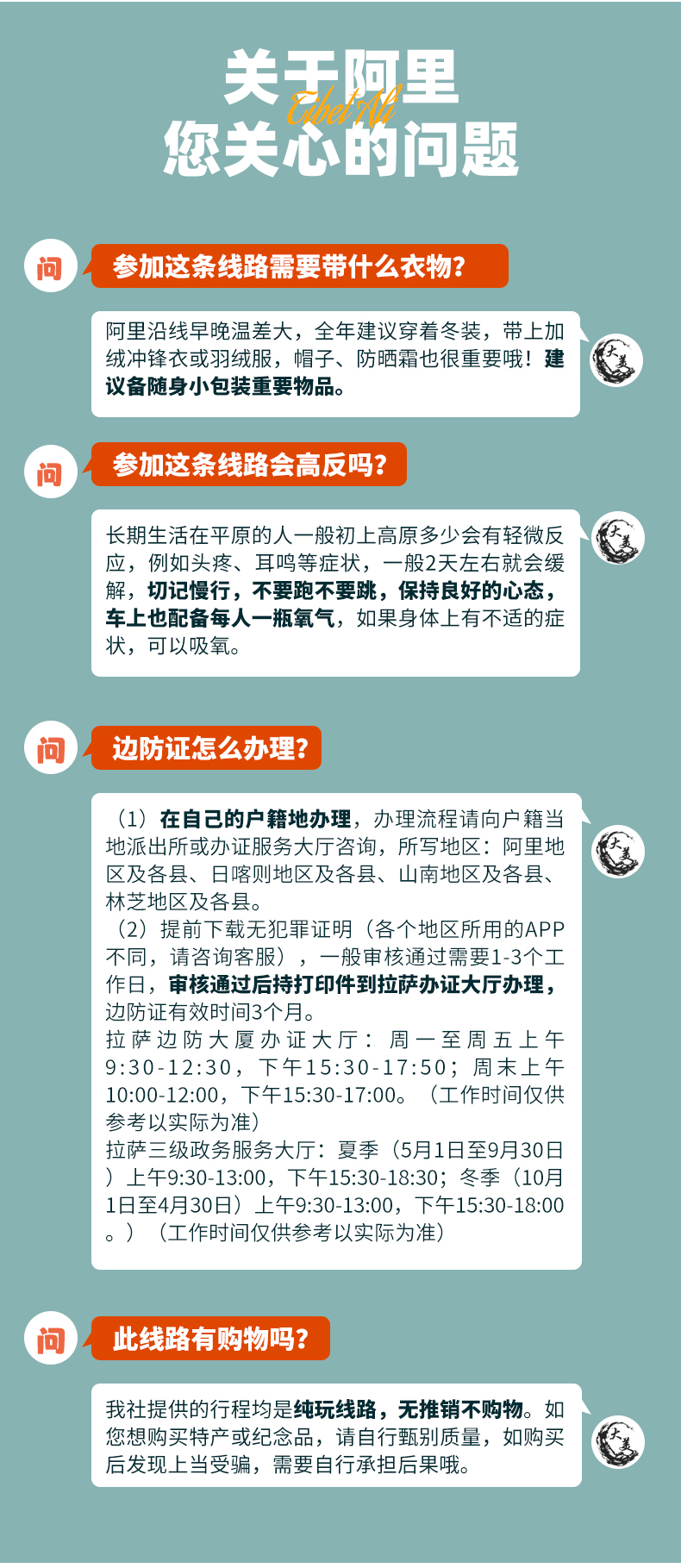 (2)到集合酒店报“大美阿里+姓名”拿房,房费已付,押金自付。入住酒店的时间一般在集合日当天的14点以后,如果您提前到达且酒店房间未整理出来无法办理入住,可将行李暂时寄存在前台,先在市区周边自由游玩;