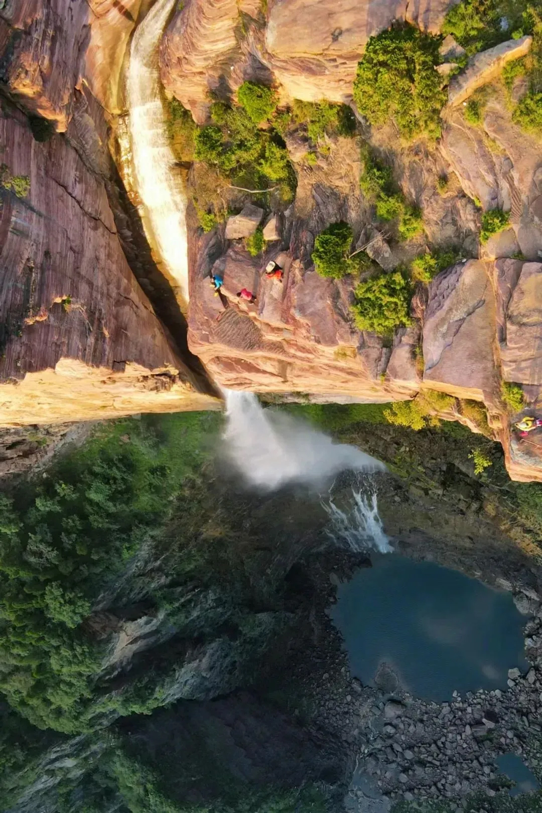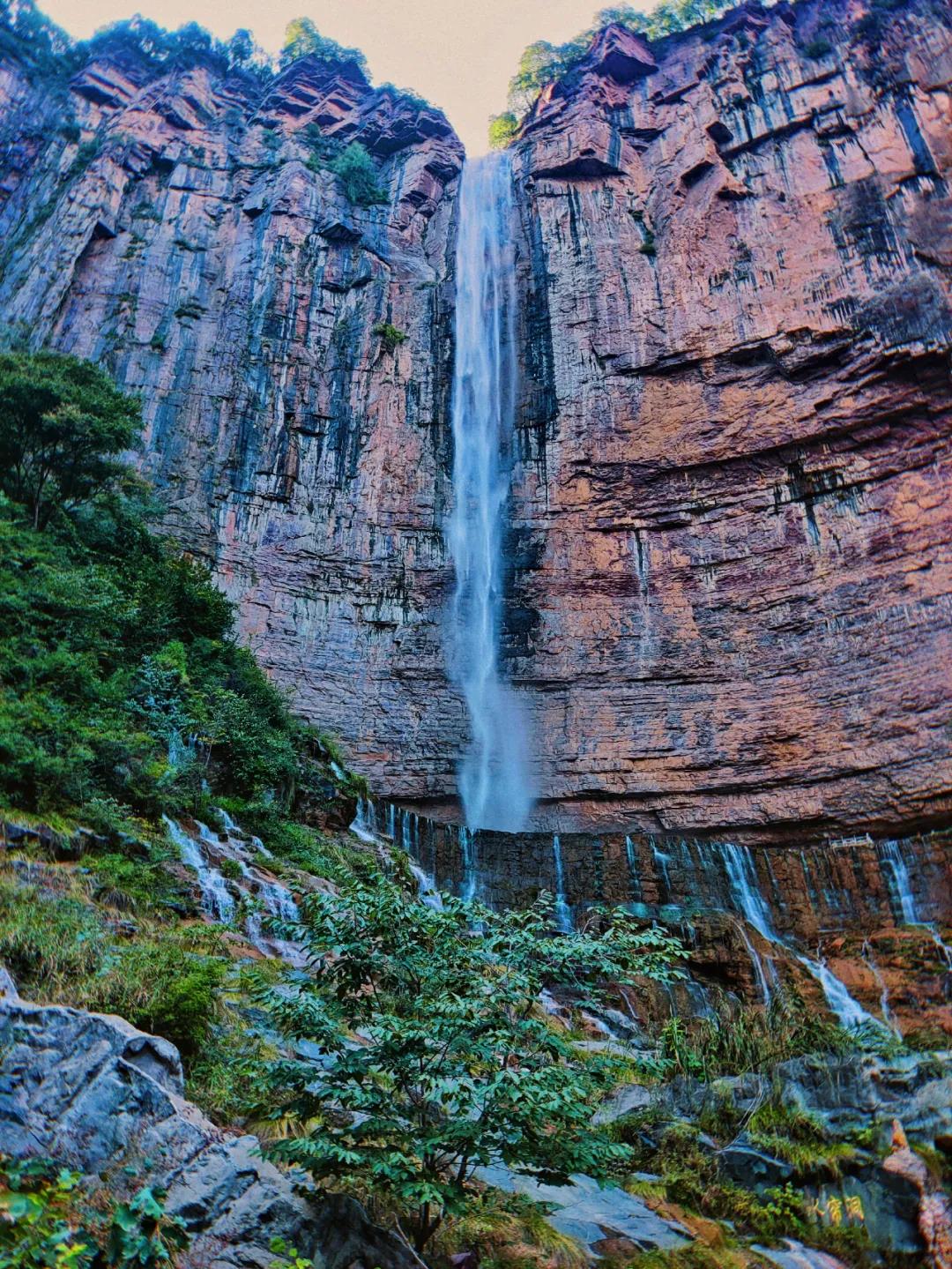 休整片刻,在赤色绝壁上行走,崖边的太行山人居住痕迹,远处是绝壁峡谷,在这样的路上行走,确实是一种享受。抵达【老龙口】,亿万年前的岩层在水流的冲击下,呈现出千层饼状态,赤红色的崖壁,层次分明映衬这湍急的水流,和旁边300多米的瀑布,那种地动山摇、 气吞山河的壮观,让人心里无比震撼。