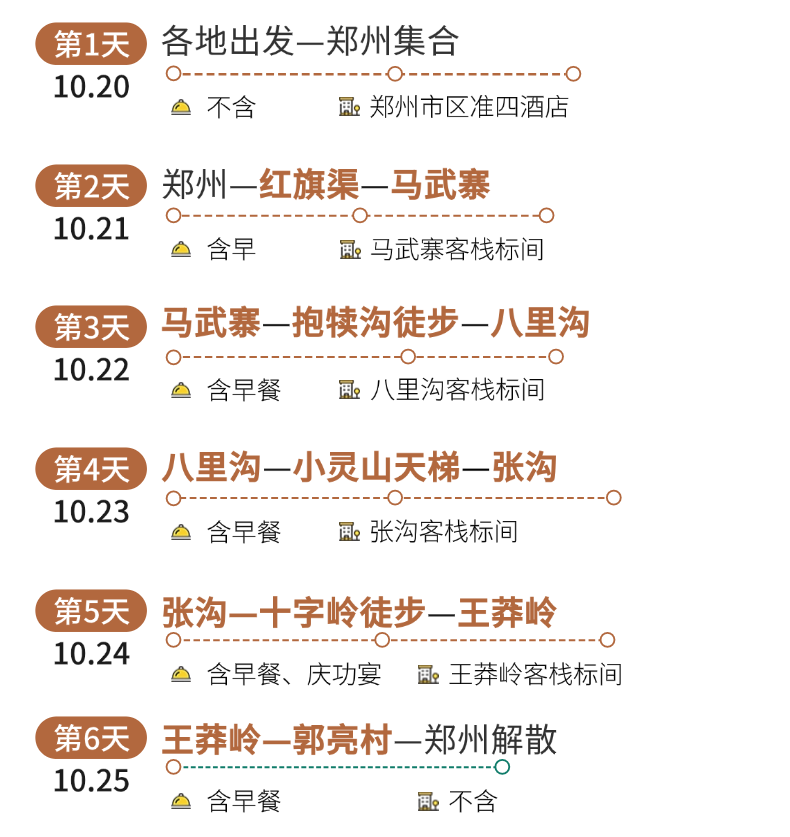 1.住宿:第1晚 郑州准四酒店标间,第2晚 马武客栈标间,第3晚 八里沟客栈标间,第4晚张沟客栈标间,第5晚 王莽岭客栈标间