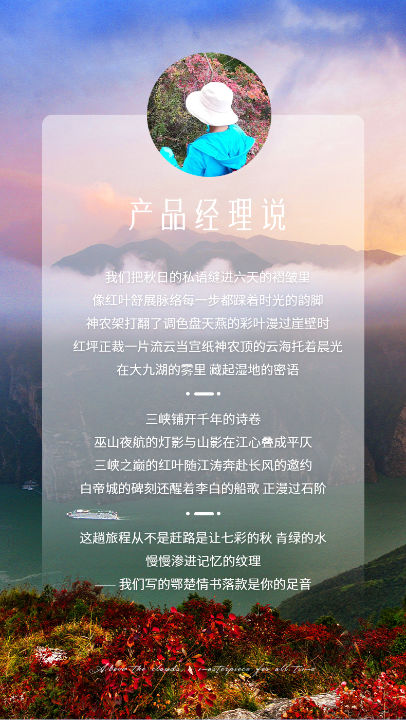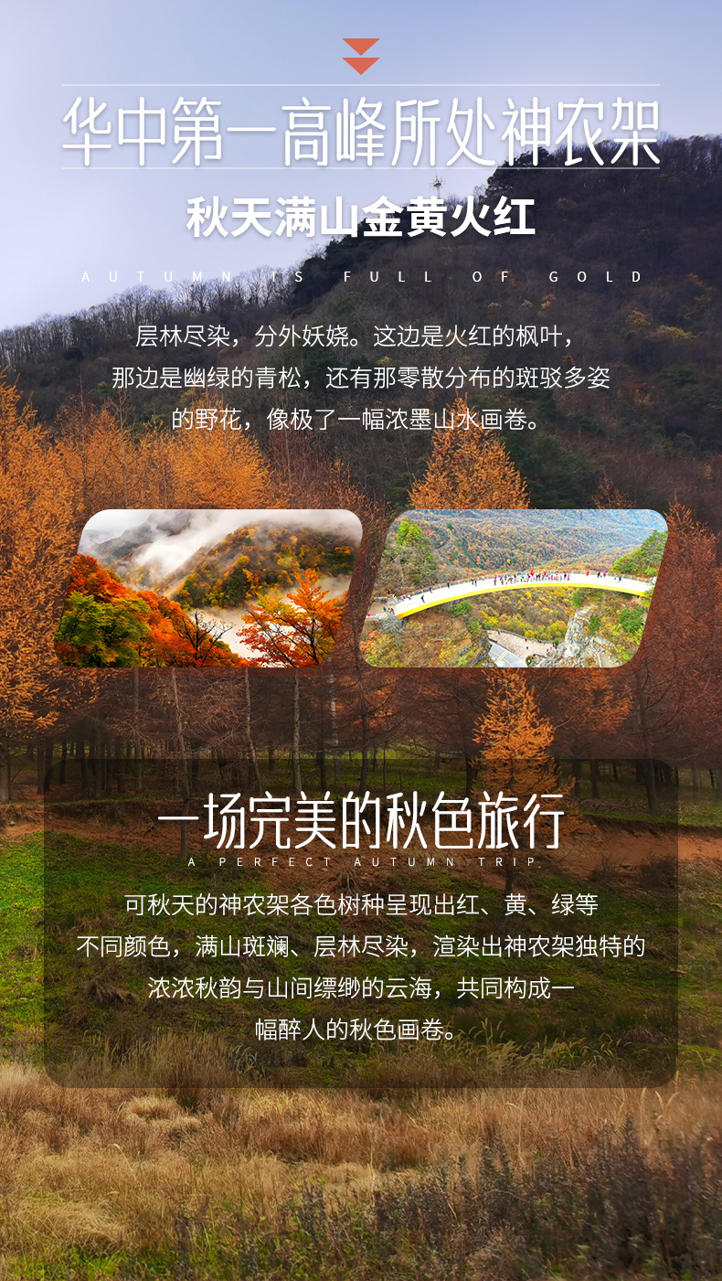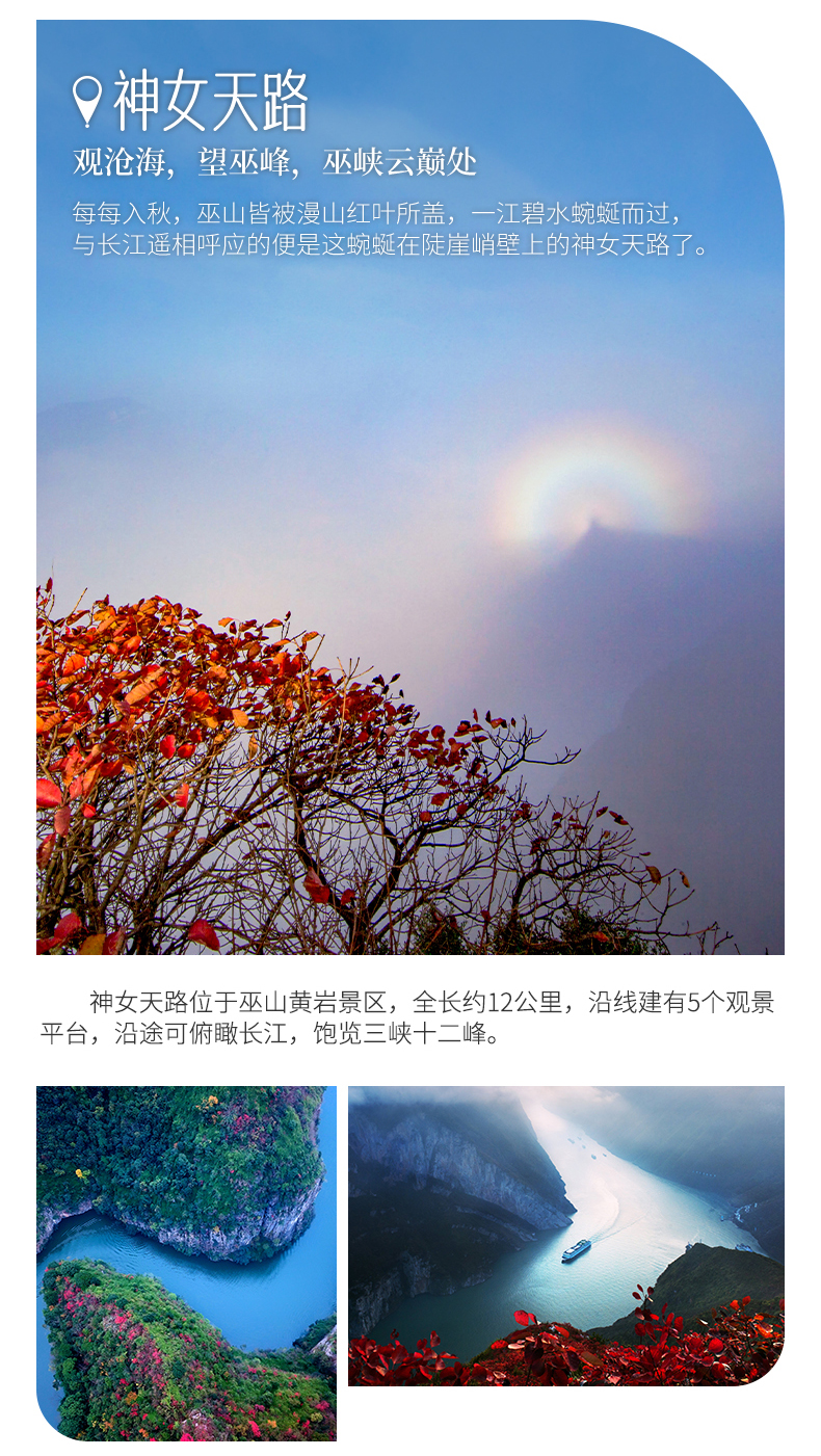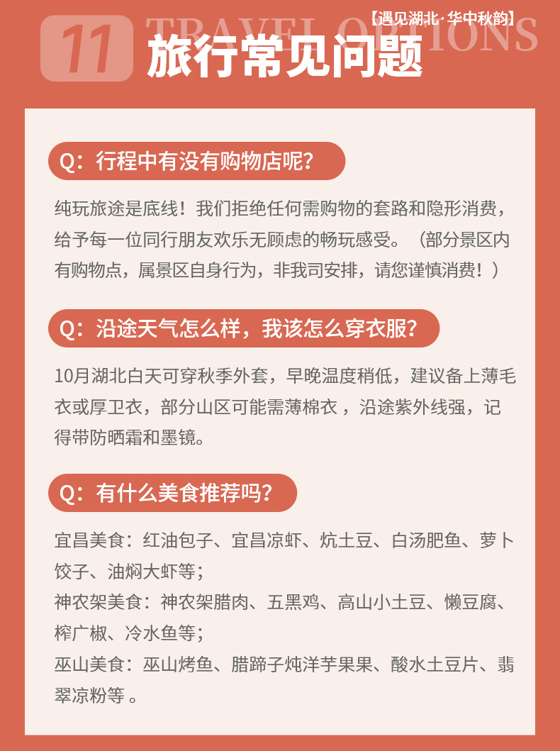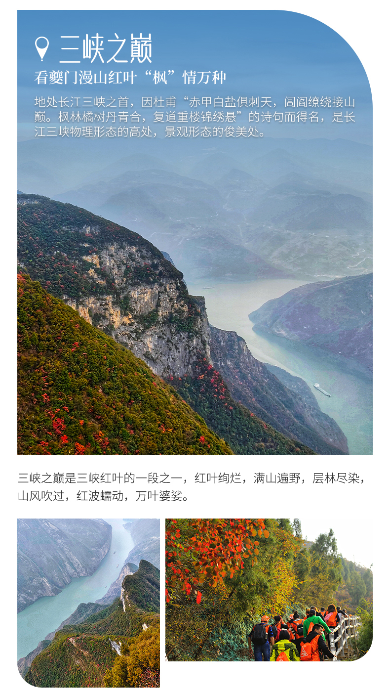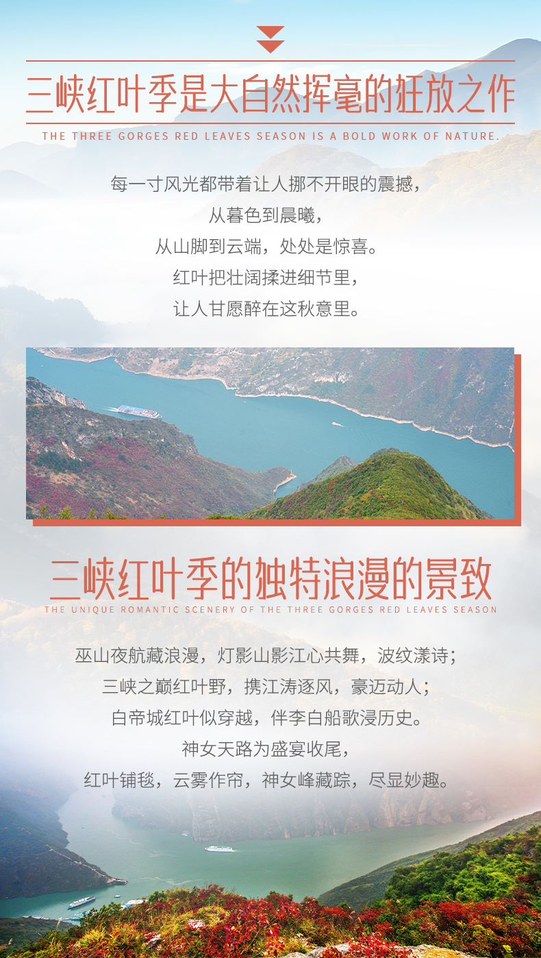 四、本线路属于秋季产品,按照往期预估,神农架秋景为10月上旬—11月初,10月中下旬是zui美时间段;三峡红叶季为10月末——12月初,11月中下旬是zui美时间段但是存在提前或延后的误差,游玩时请合理期待实际景色。