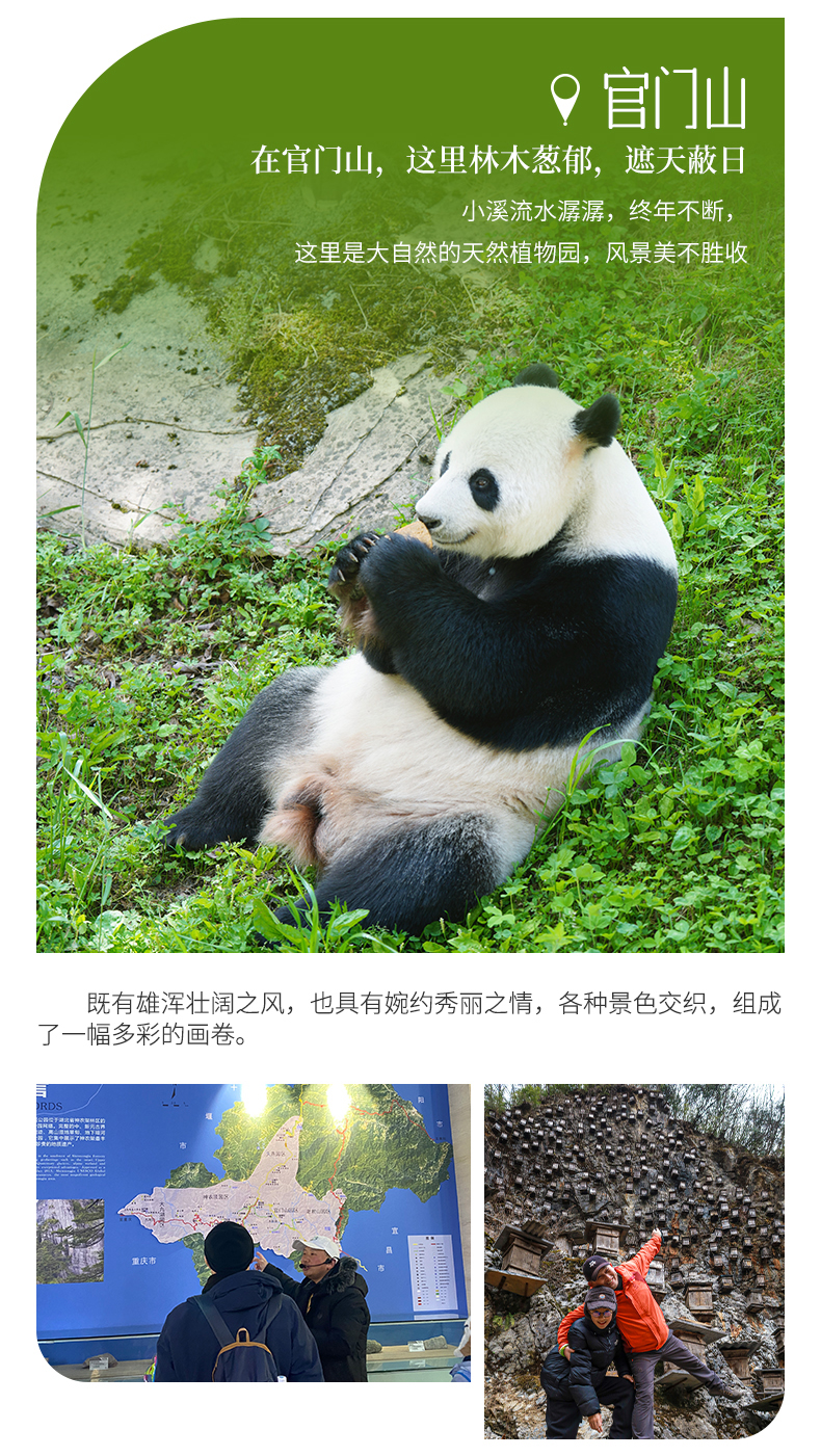 官门山物种丰富、山险林奇、山水相映、环谷幽深,以探索与发现为主题的科考、科研、科普体验区,全长8公里的长峡集中分布亚热带到寒温带的植物物种2500余种。我们主要观赏网红景点【岩壁蜂巢】,以及【熊猫馆】观赏熊猫“奥运”和“韵韵”。