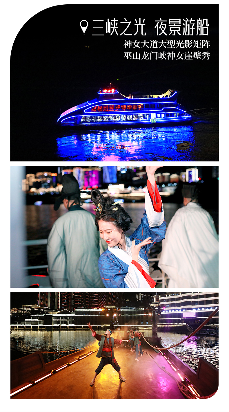 船游过程中包含:非遗民俗歌舞互动表演;神女大道光影矩阵;南陵春晓诗词演绎;巫山龙门峡神女崖壁秀。