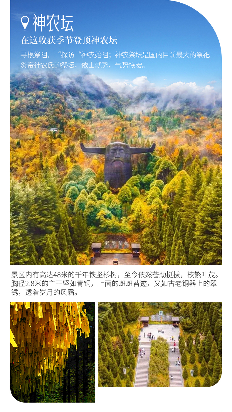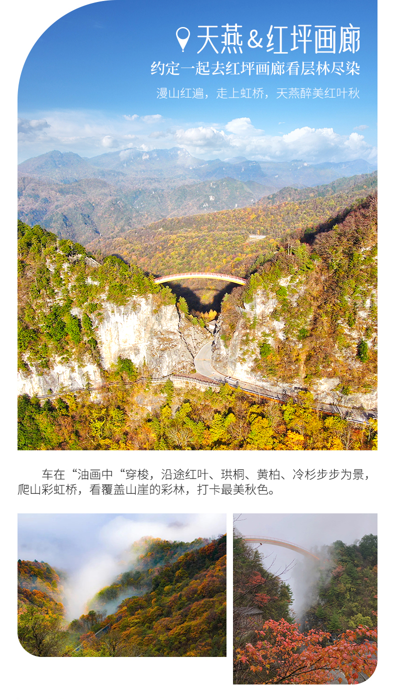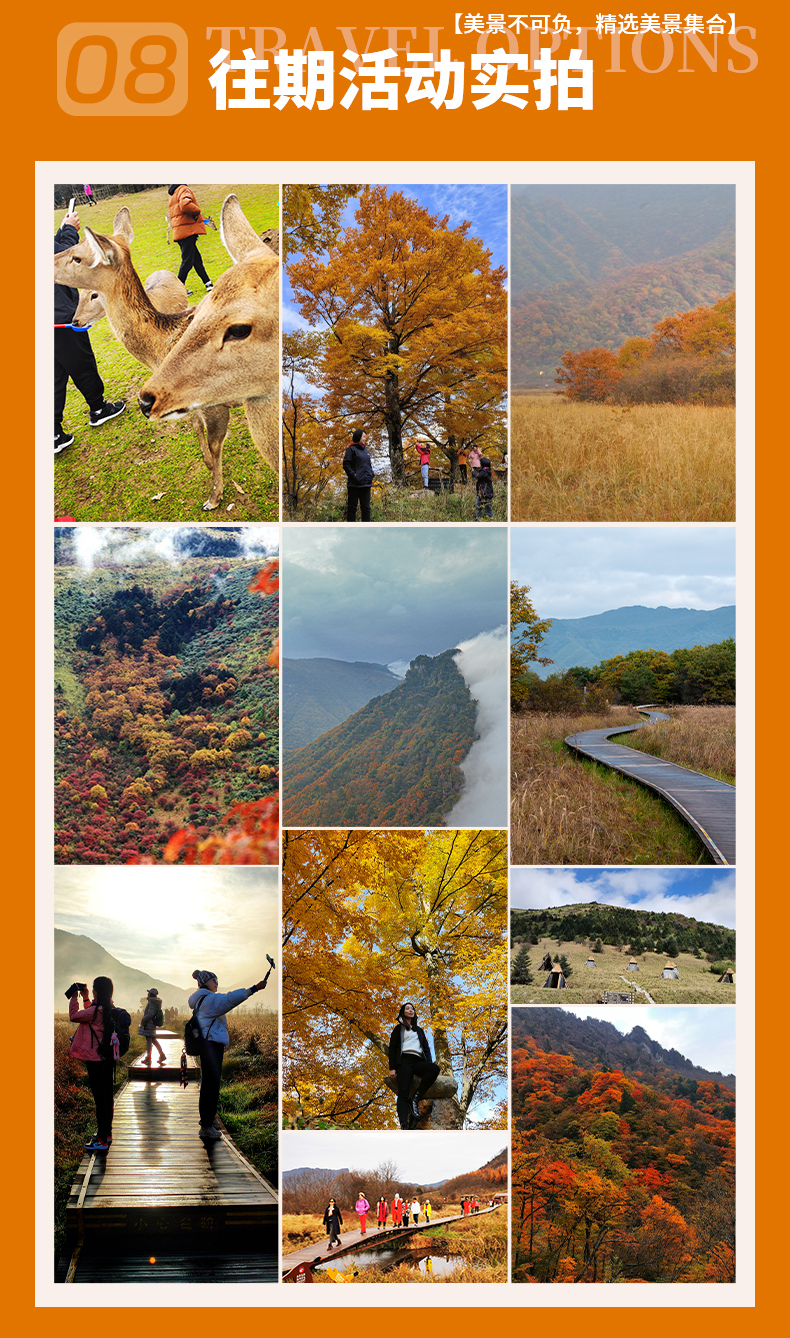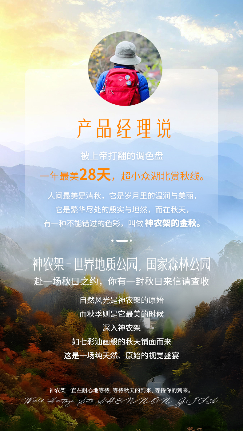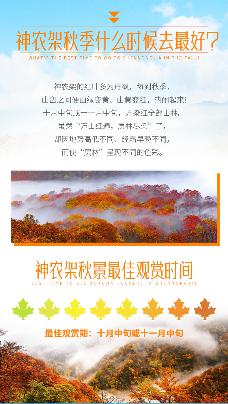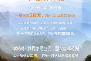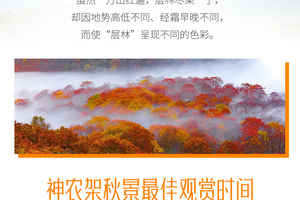 三、本线路属于秋季产品,按照往期预估,神农架秋景为10月上旬—11月初,10月中下旬是zui美时间段,但是存在提前或延后的误差,游玩时请合理期待实际景色;