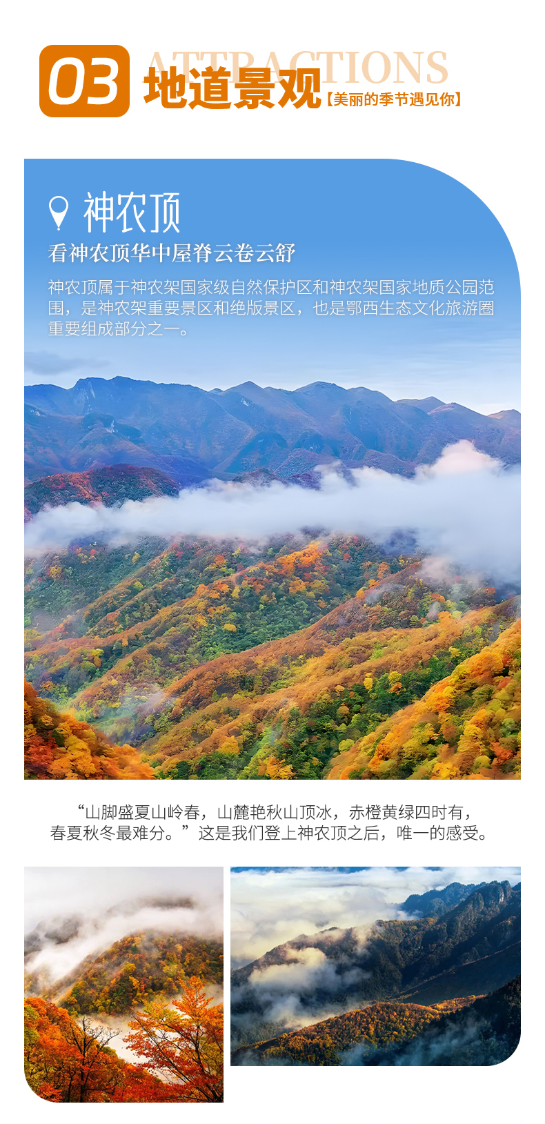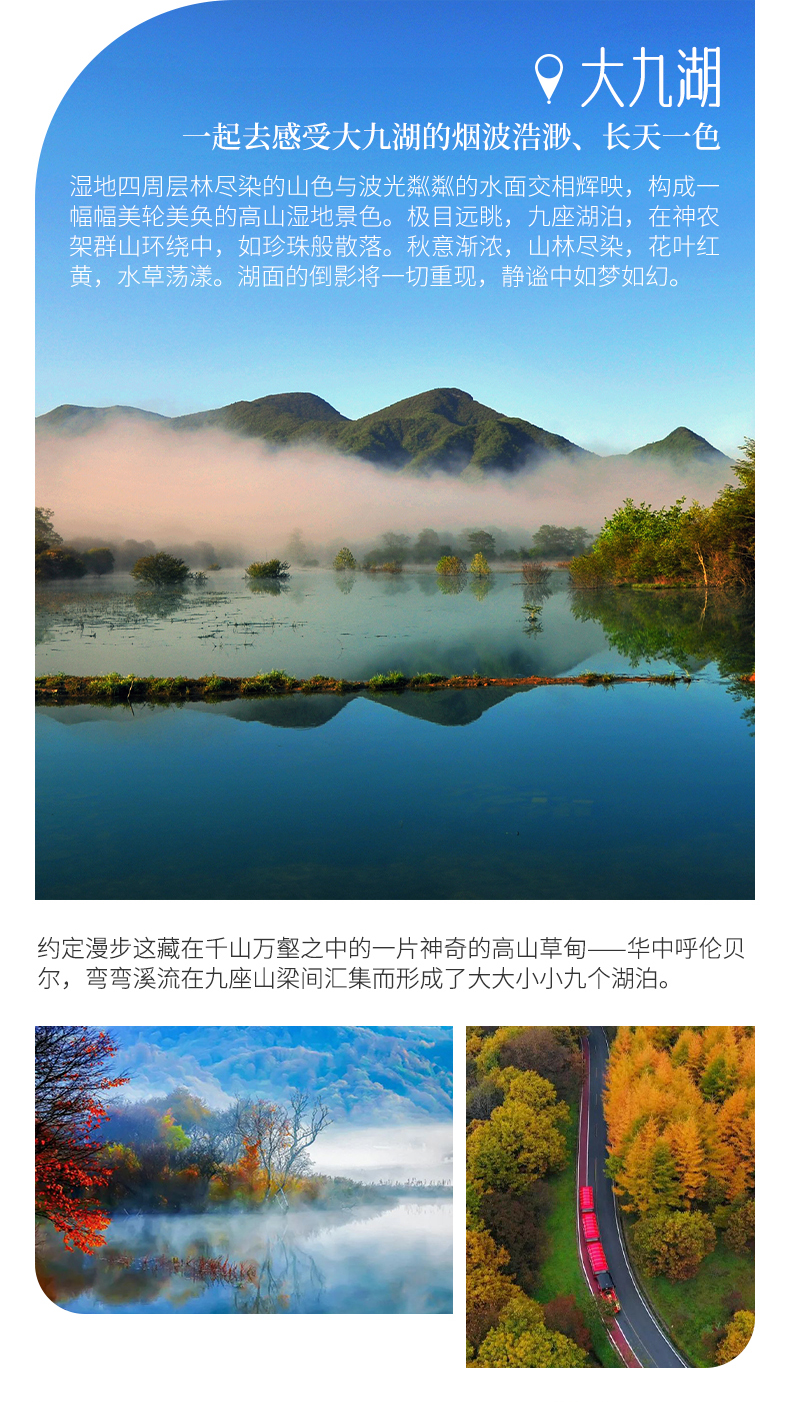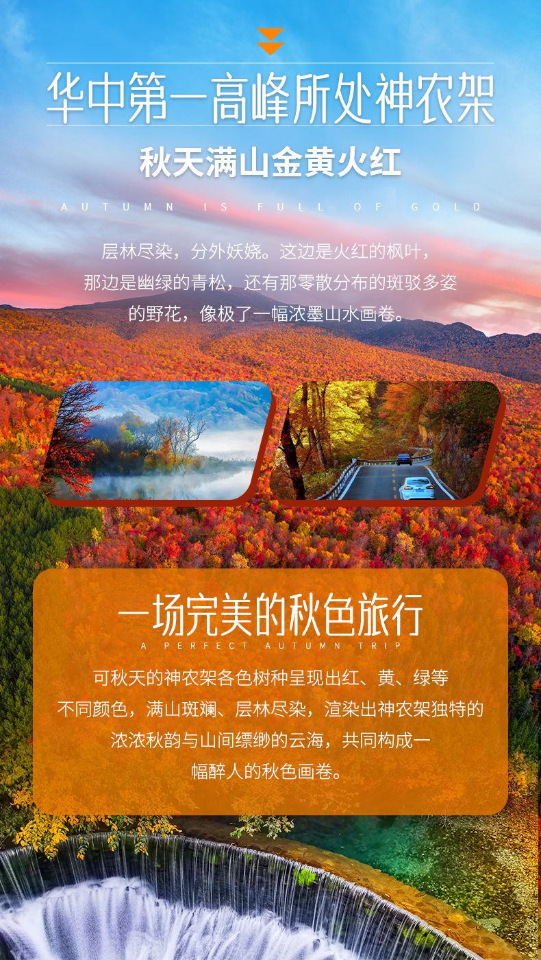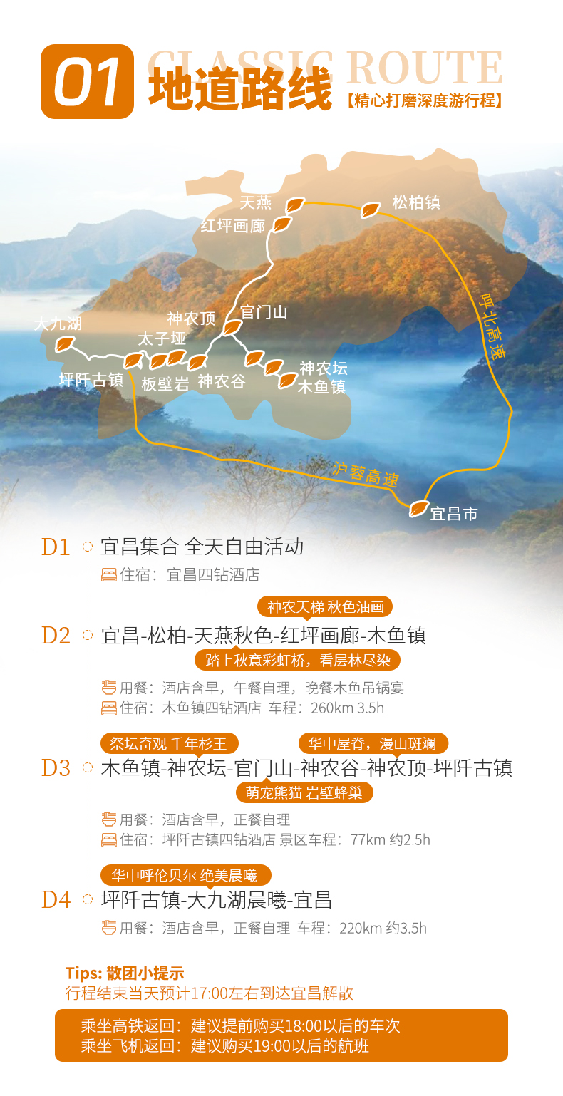 三、本线路属于秋季产品,按照往期预估,神农架秋景为10月上旬—11月初,10月中下旬是zui美时间段,但是存在提前或延后的误差,游玩时请合理期待实际景色;