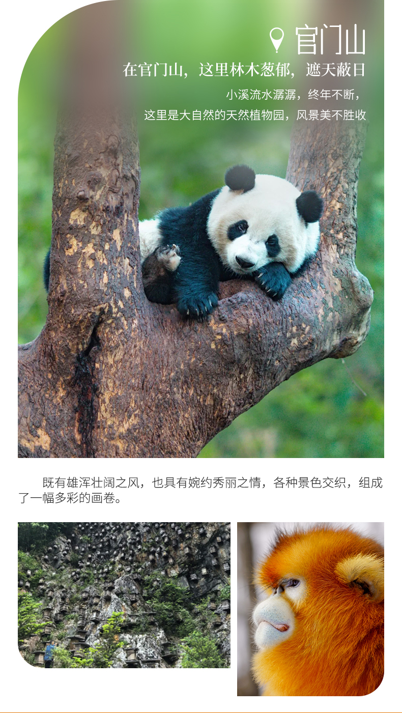官门山物种丰富、山险林奇、山水相映、环谷幽深,以探索与发现为主题的科考、科研、科普体验区,全长8公里长峡集中分布了亚热带到寒温带的植物物种2500余种。我们主要观赏网红景点【岩壁蜂巢】,以及【熊猫馆】观赏熊猫“奥运”和“韵韵”。