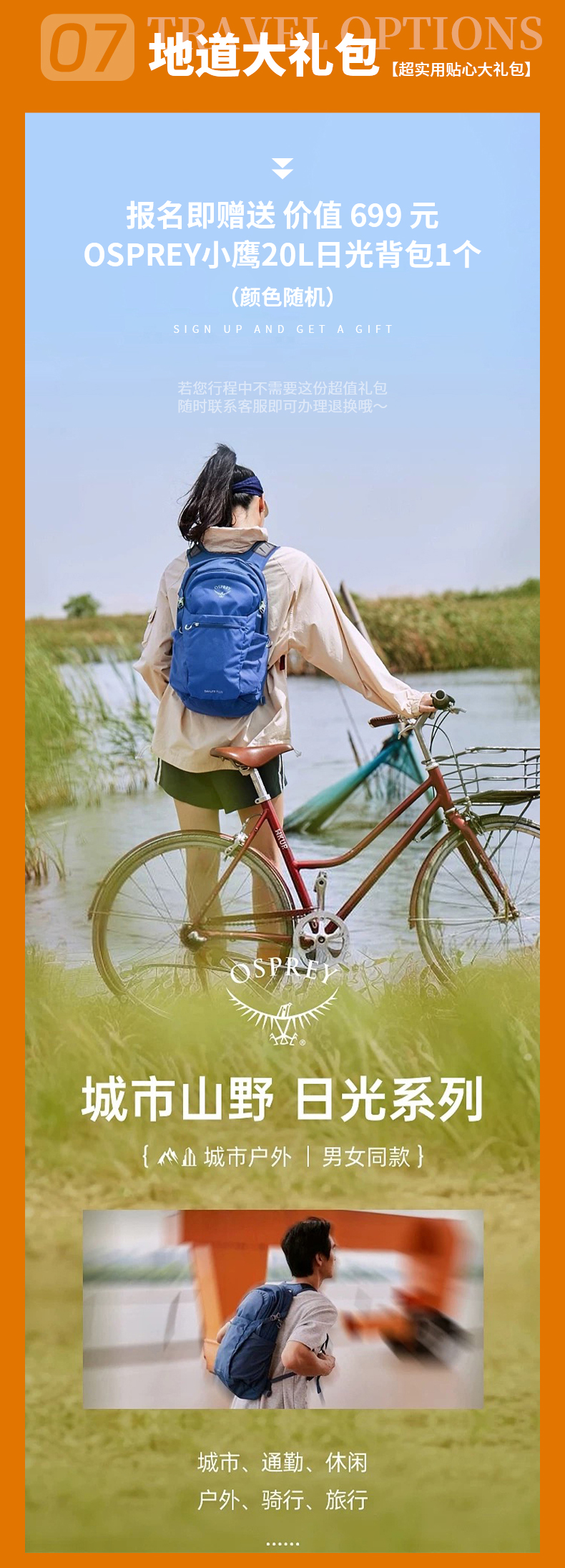 8.【赠送】价值699元 Osprey Daylite Plus 小鹰日光20L通勤背包1个(颜色随机)如需升级可加400元更换价值1299元 OSPREY HIKELITE 小鹰骇客 18L户外背包(颜色随机)