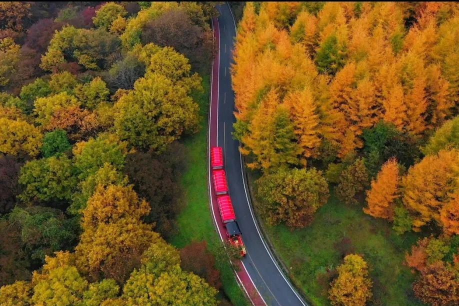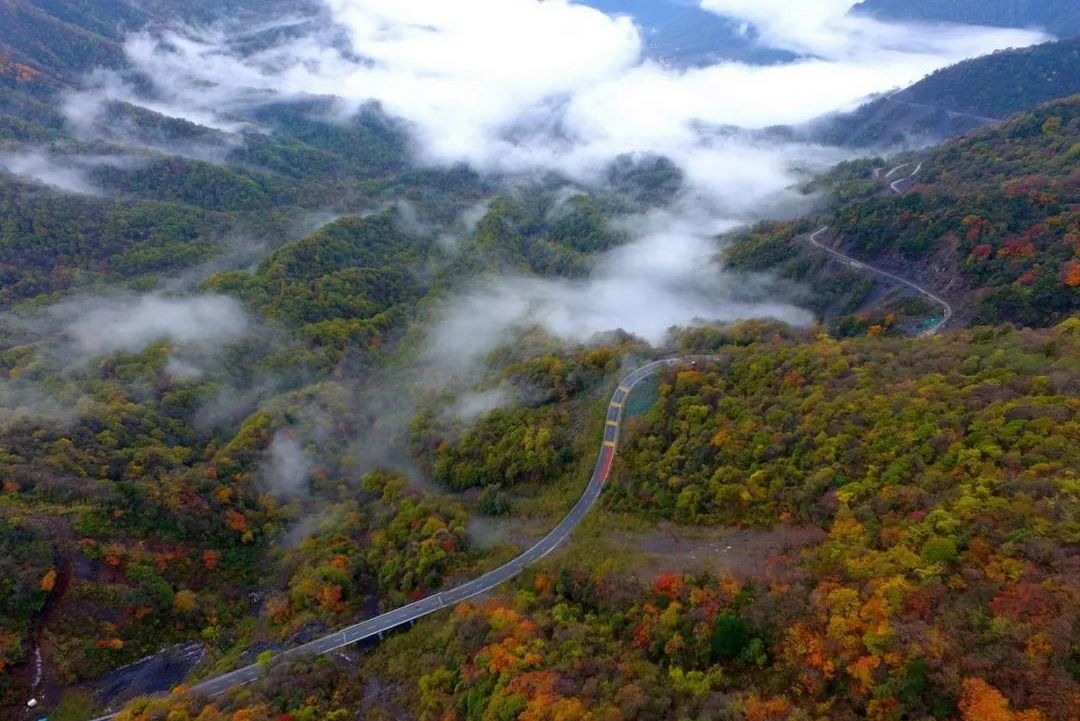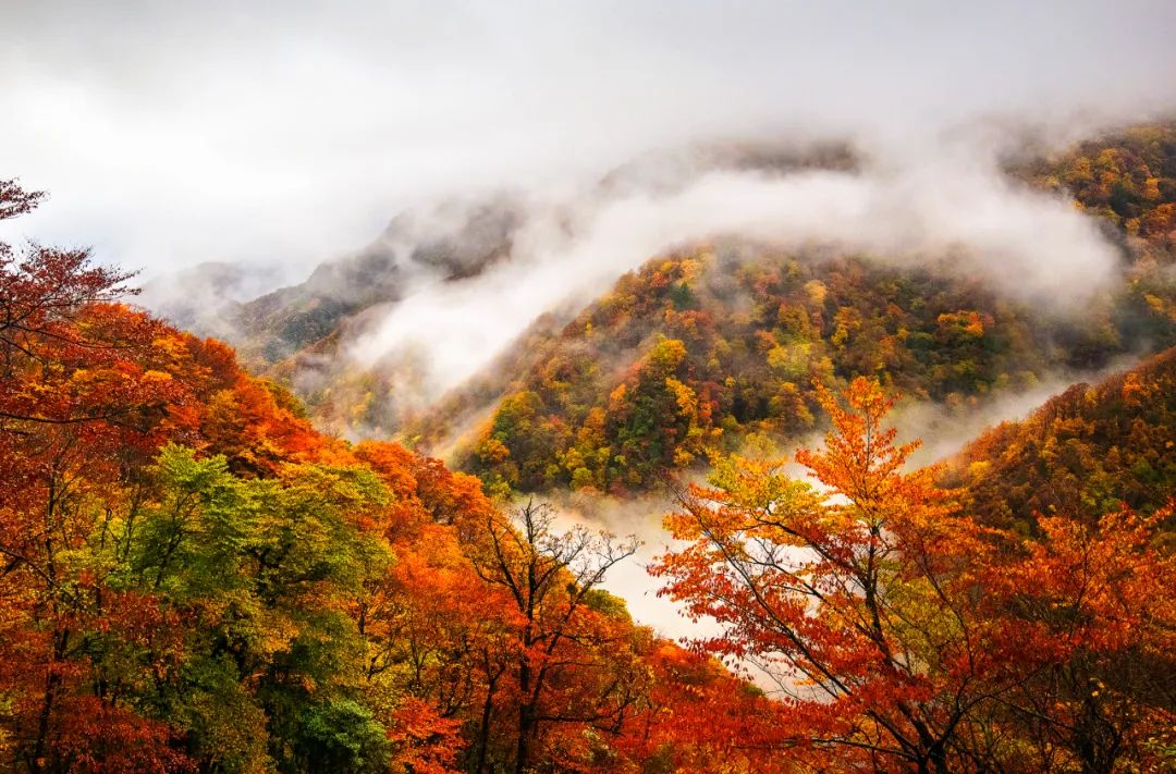 金秋时节,这里的森林五彩斑斓,变色的枫树、鹅掌楸、连香树、海棠、核桃和板栗树,混杂在常绿植被之中,就像油画家不小心打翻了颜料罐,各种色彩沿着山脊一路流淌,如火如荼的红色、耀眼的金黄色、葱葱郁郁的翠绿色、明丽的蔚蓝色,一层层的涂抹开来…美不胜收。