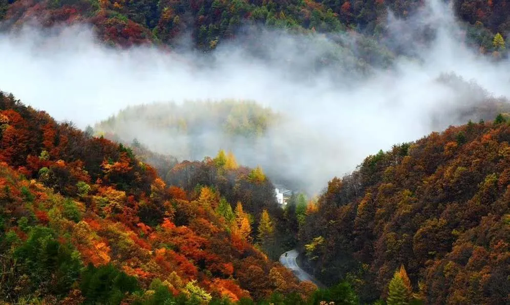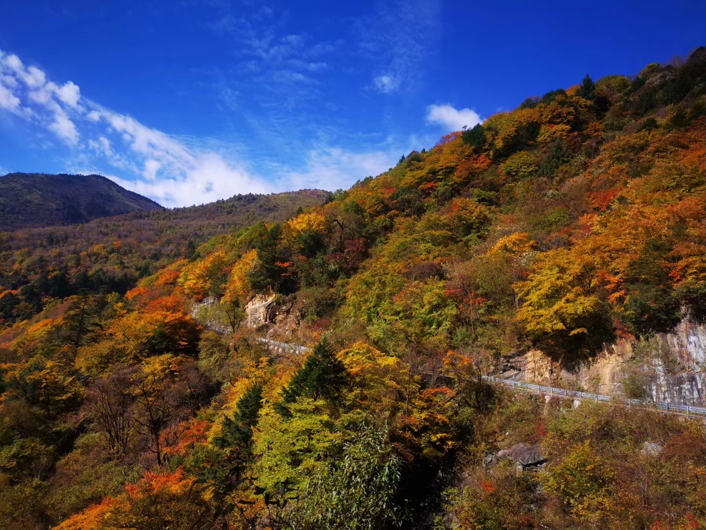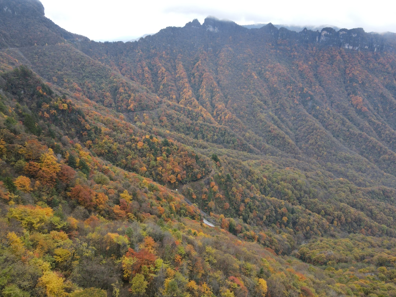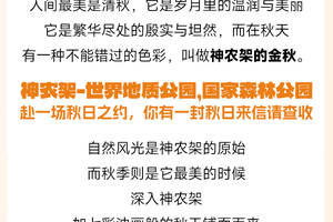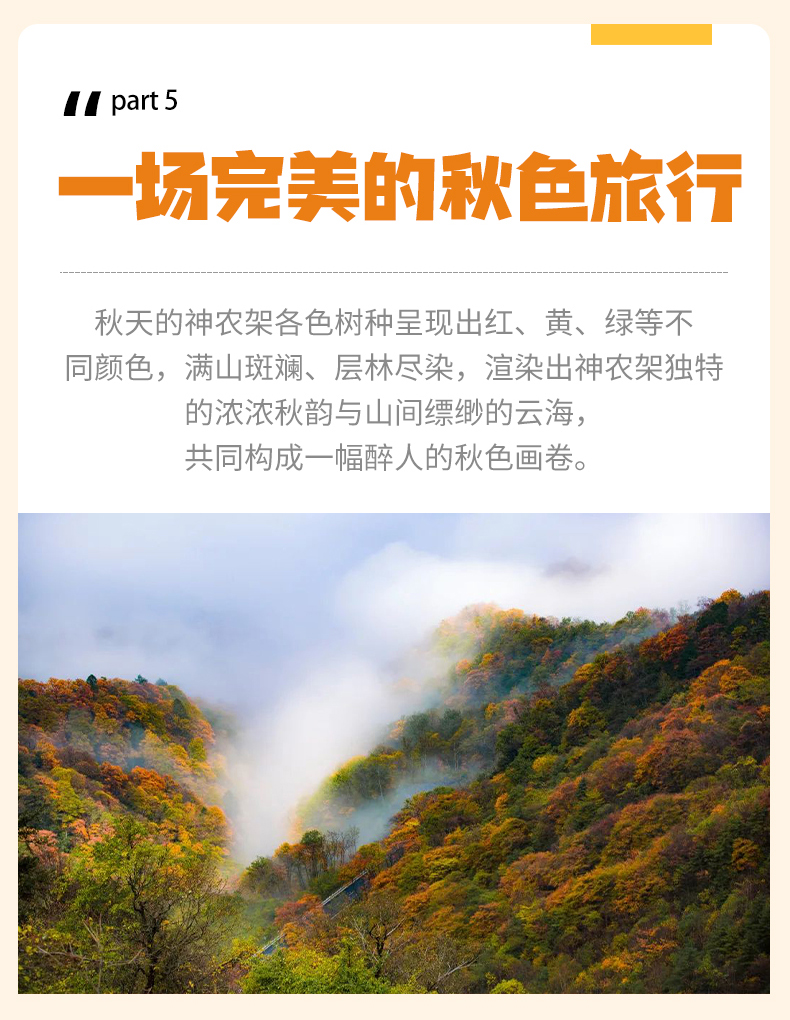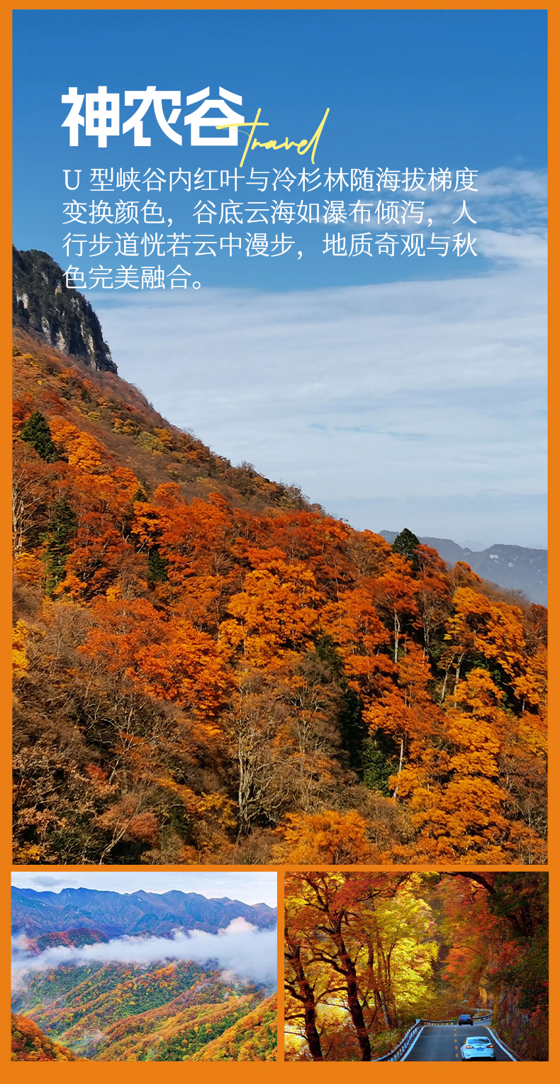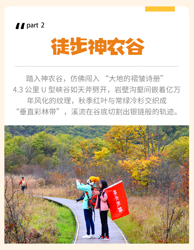 踏入秋日的神农谷 - 华中第一哨徒步路线,便如同翻开了一幅色彩浓烈的山水画卷。起点处的神农谷,层林尽染,枫树、乌桕、黄栌等树木在秋风中变换着色彩,深红、橙黄、绛紫交织,与苍翠的松杉相互映衬,将山谷装点得如诗如画。