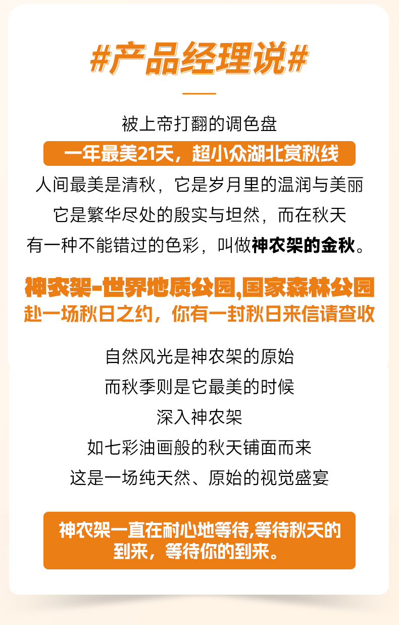 ●本线路属于秋季产品,按照往期预估,红叶季为10月末—12月初,11月中下旬是应急时间段,但是存在提前或延后的误差,游玩时请合理期待实际景色。