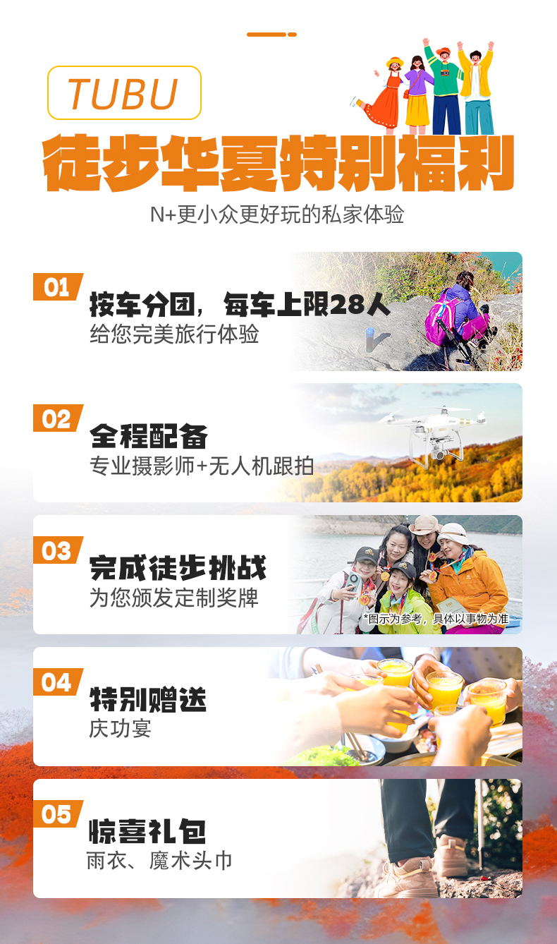 本产品以徒步旅行为主,适用于8-65岁身体健康人士