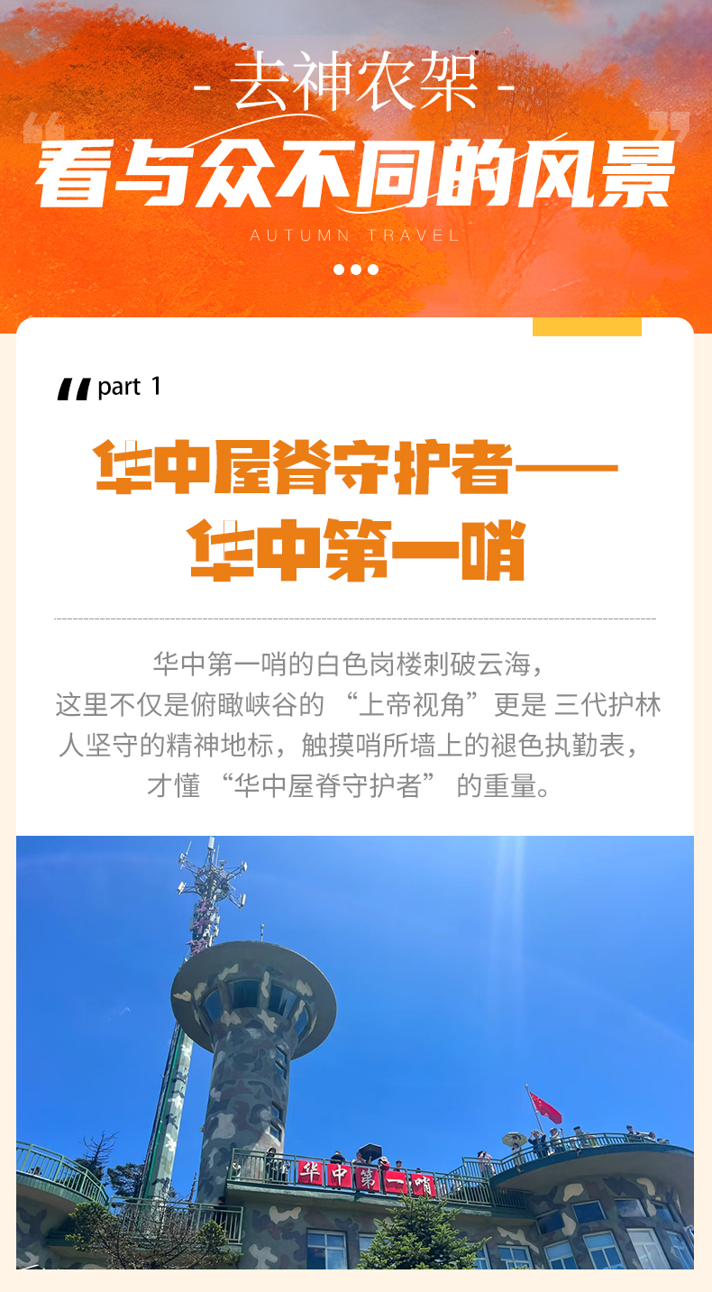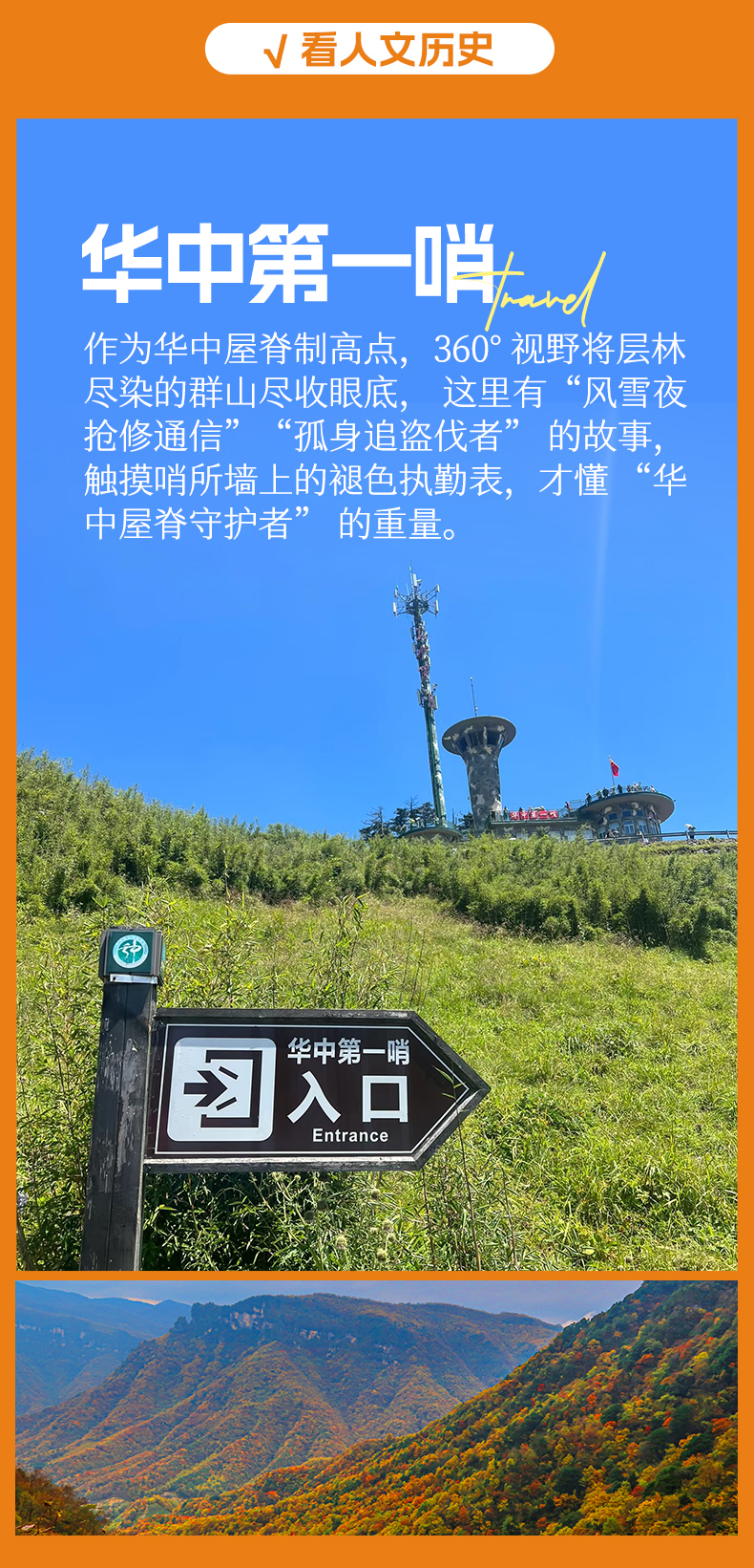 临近华中第一哨时,古朴的哨所建筑矗立在山巅,诉说着一段段守护的故事。站在哨所前眺望,群山在秋色中连绵起伏,云雾缭绕其间,若隐若现,仿佛置身于仙境之中,让人在欣赏绝美秋景的同时,也能感受到历史与自然交融的独特韵味。