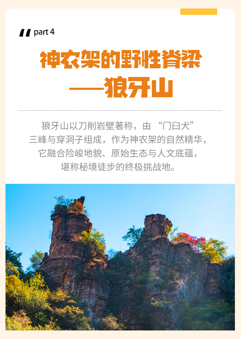 踏上狼牙山的徒步征程,仿佛一头扎进了大自然雕琢的险峻秘境。随着海拔攀升,锯齿状分布的门齿峰、臼齿峰、犬齿峰渐次展露全貌,远望去,主峰门齿峰海拔1900 米,尖锐的峰顶直插云霄,整座山体宛如倒竖的狼牙,透着令人敬畏的气势。