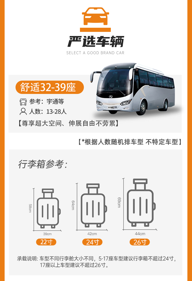 1、交通:行程中旅游包车费用,油、路、桥费,11-38座用车,保证一人一正座;