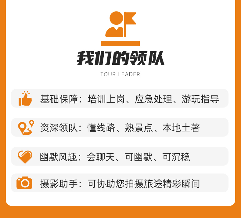 ● 活动介绍页展示的导游领队,可能并非最终实际带队领队,本公司有权根据活动安排等实际情况进行调整,游客报名即表示知晓并理解本情况。