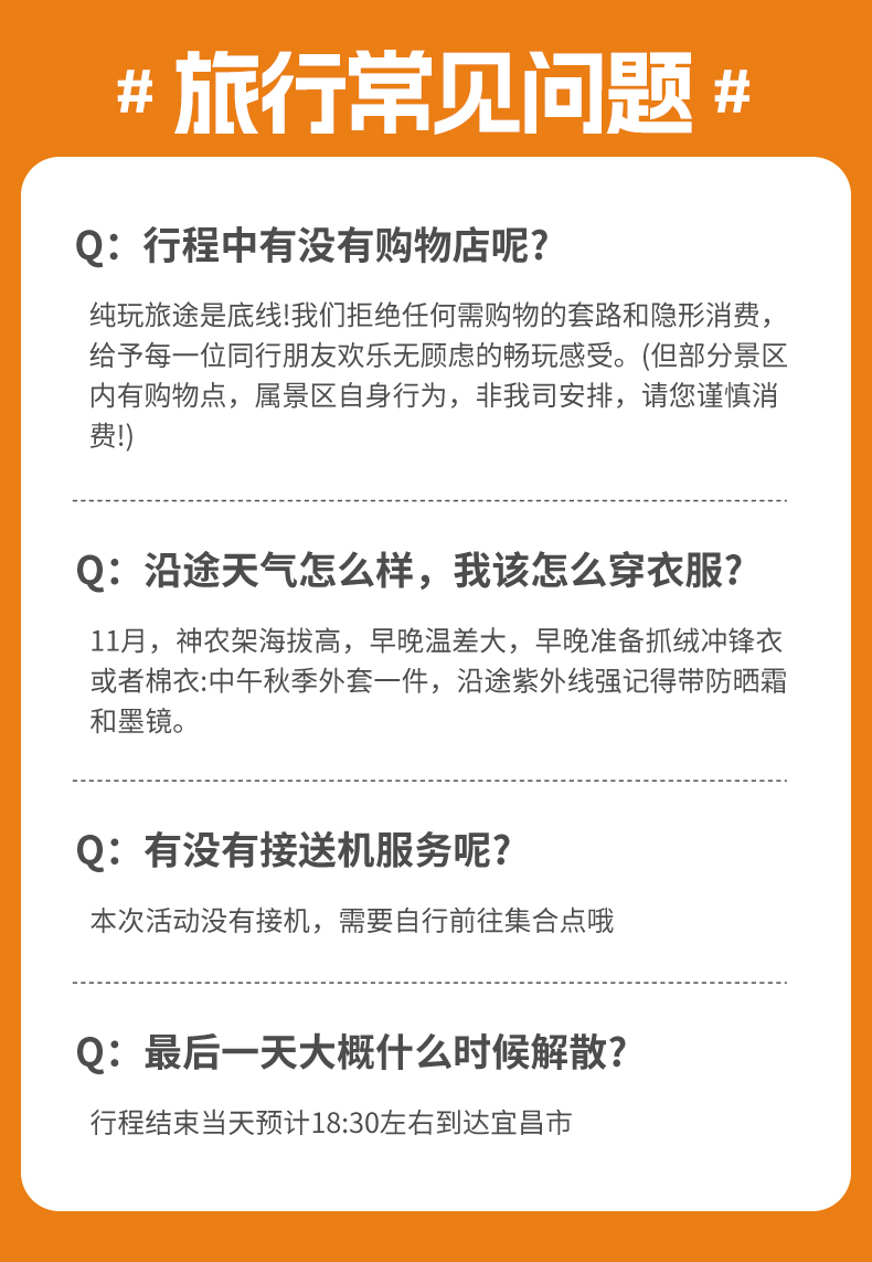 1、行程结束当天预计18:30点左右抵达宜昌解散。