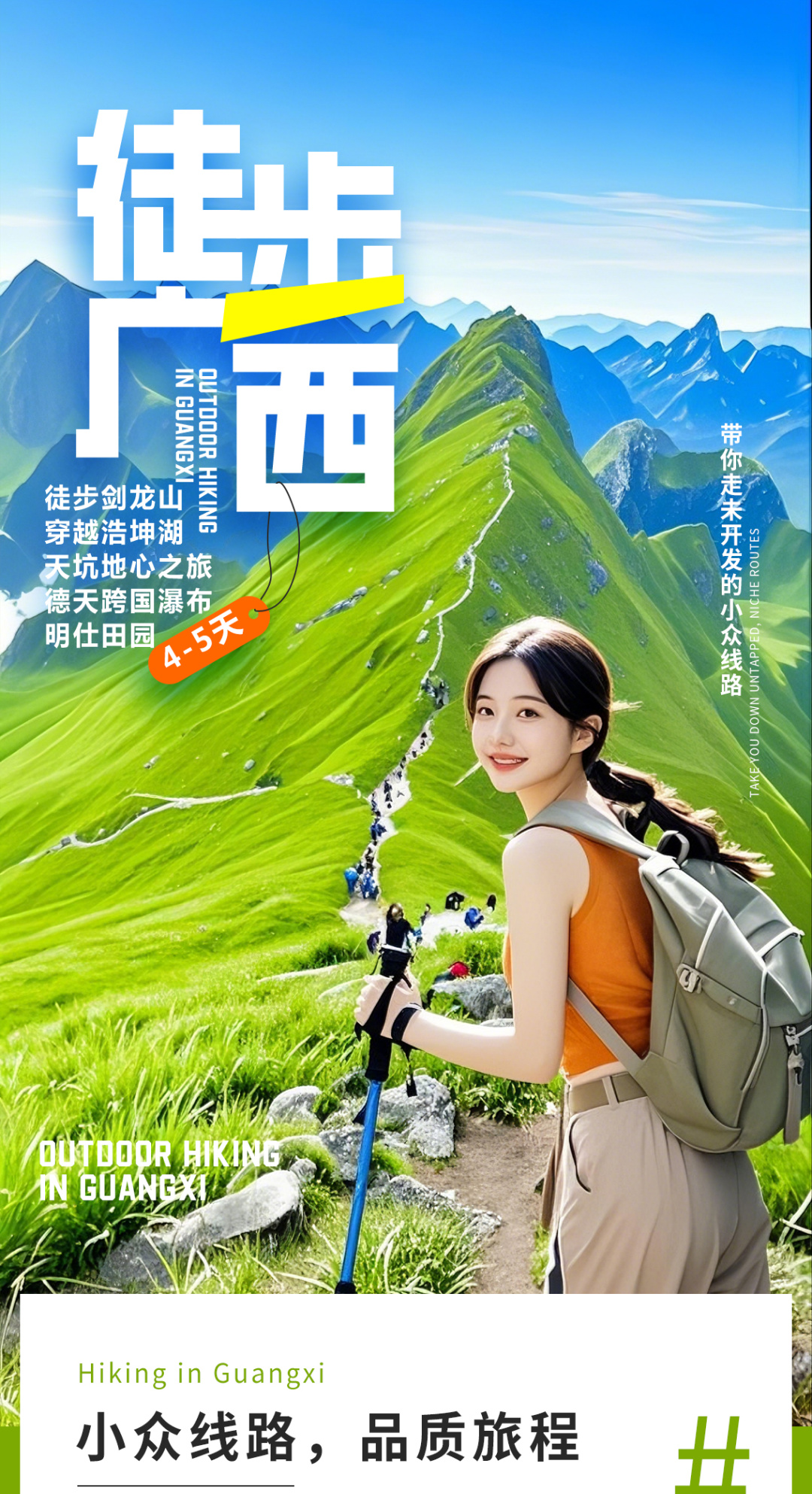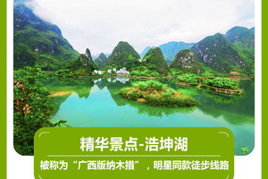 08:00早餐后出发,坐车1小时到达浩坤湖徒步起点,今天徒步网红浩坤湖穿越线,全程约13公里,爬升500米,徒步6小时左右。中午也是路餐干粮。这里也是广西山水经典的徒步景色