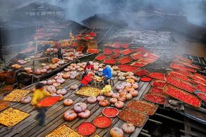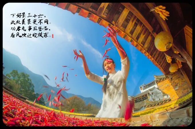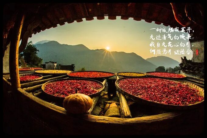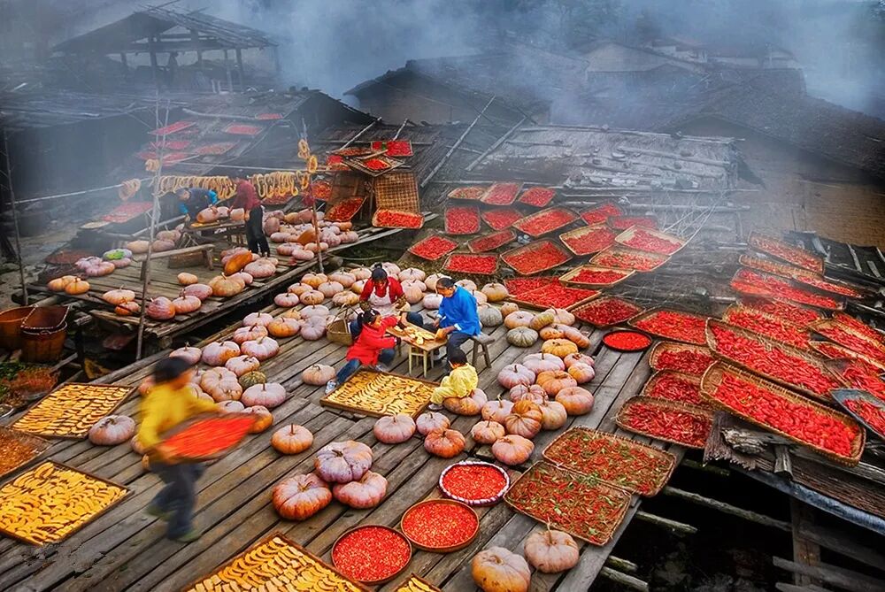 乡民们,把南瓜辣椒红豆绿豆稻子晾晒在阳光之下,层叠的老宅瓦房上,登高远看这看似平凡的劳作景象,不经意间构建出一幅世外桃源。