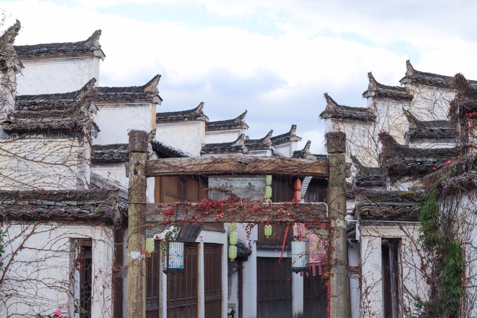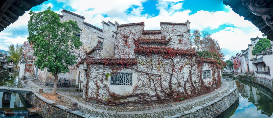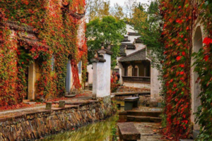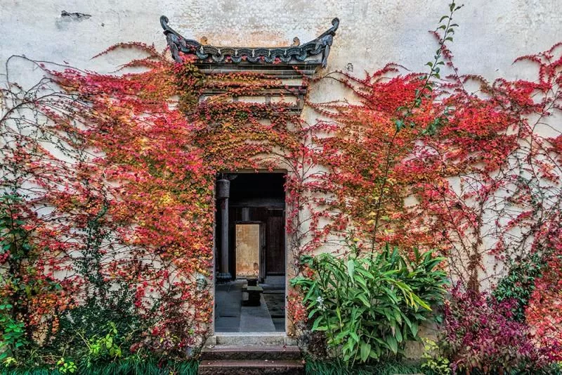 在秋天,秀里的爬山虎开始由绿变红,变红的爬山虎爬满了马头墙,不经意中仿佛展示了徽州女人的秀美和娇媚。