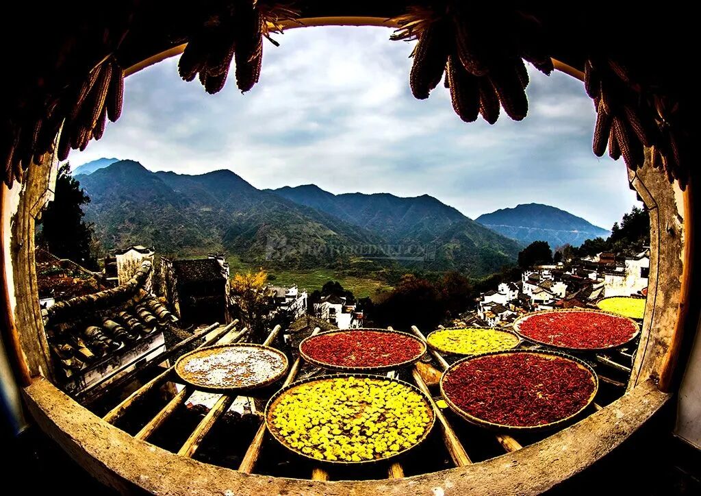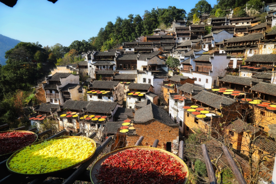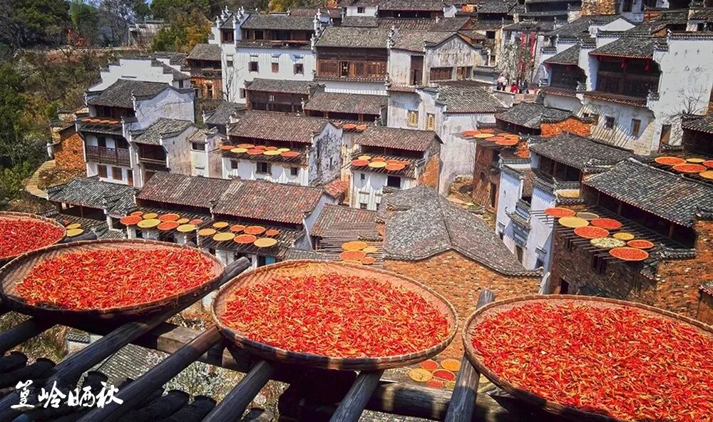 而在婺源有一种秋,叫篁岭晒秋。每年秋收过后,家家户户都把收货的作物放在前庭后院晾晒,经过长时间的暴晒,作物水分蒸发,便能存放到来年不发芽。