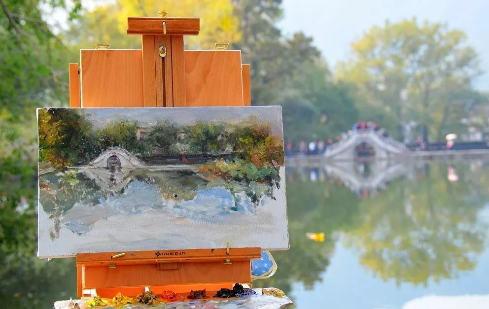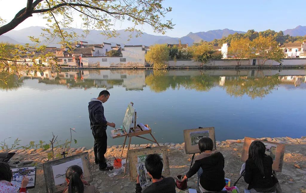秋日的村子,天高气爽,满眼的金黄。三三两两的学生会围坐在南湖边,聚精会神地写意。