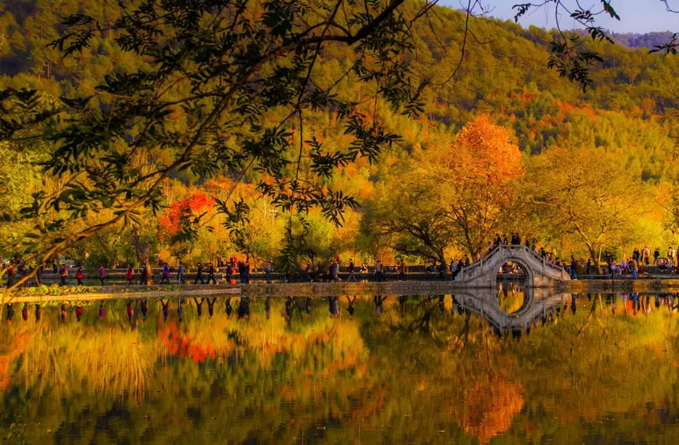 秋天的奇墅湖,水杉、乌桕火红的在水边摇曳,余晖之下,碧绿的湖水背靠着连绵的大山,静谧幽深,宁静而又悠远。