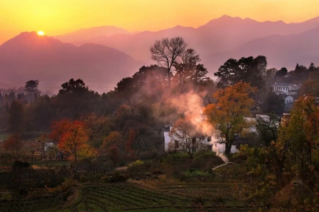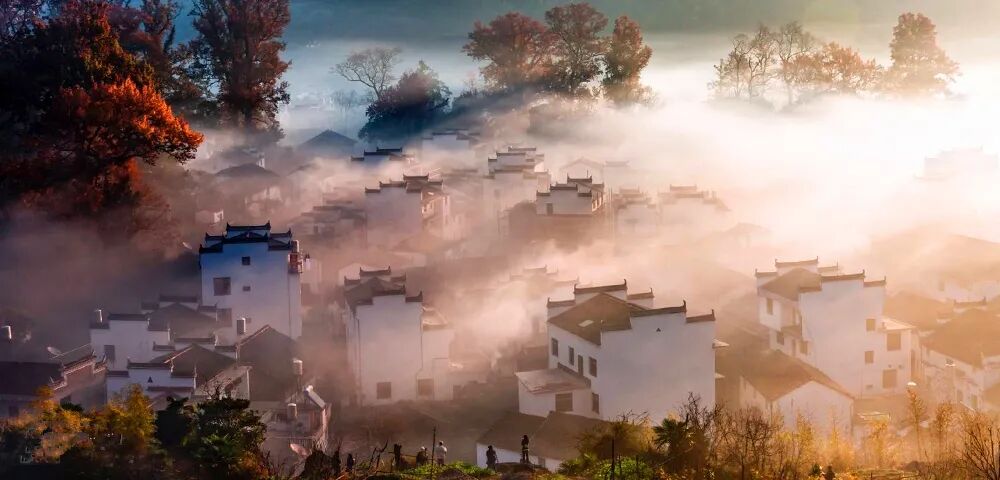 通常7点左右,太阳冒出山头,形成这里特有的山间日出。因温差效应,村子里被晨雾笼罩,在阳光的加热下,慢慢驱散,在青瓦白墙红枫的映衬下,这景观非常梦幻!