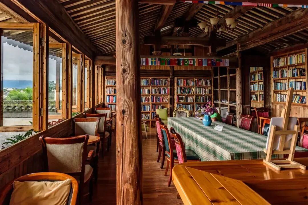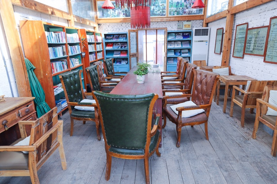 二楼更是别有洞天。通过屋侧窄窄的木梯,便可来到二楼的书吧。书吧中间是一条长木桌和沙发桌椅,靠窗则放置了几处茶桌。还有近千册人文、艺术、社科领域的书籍供读者免费阅读。