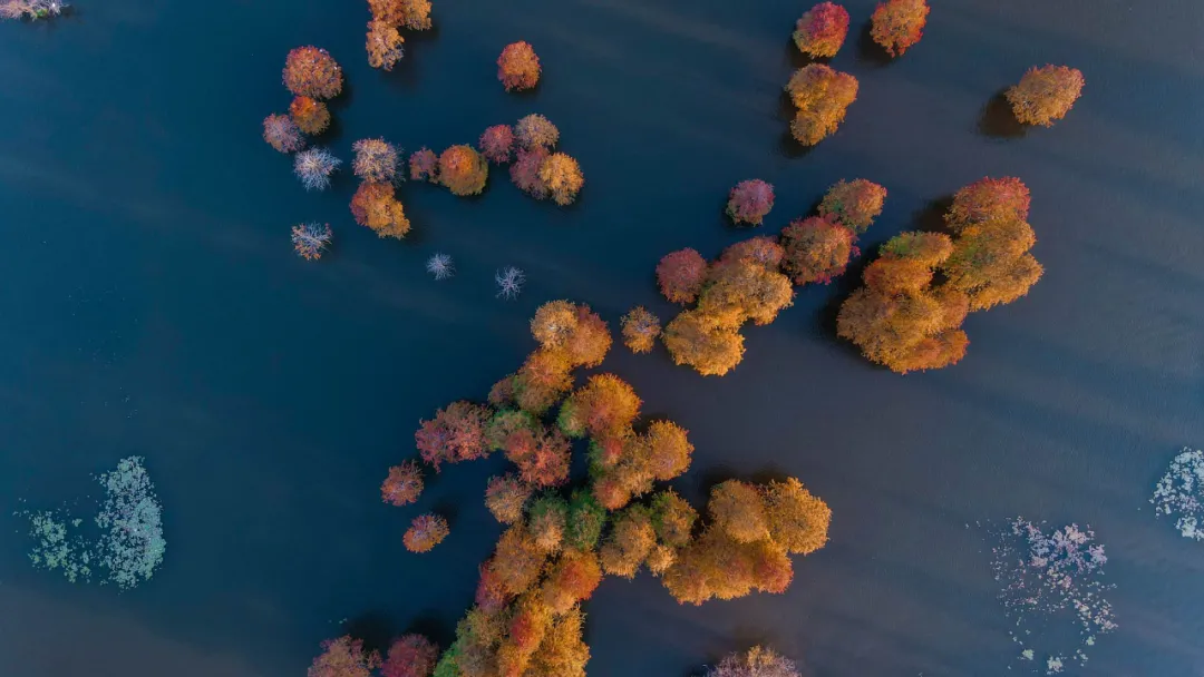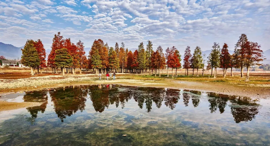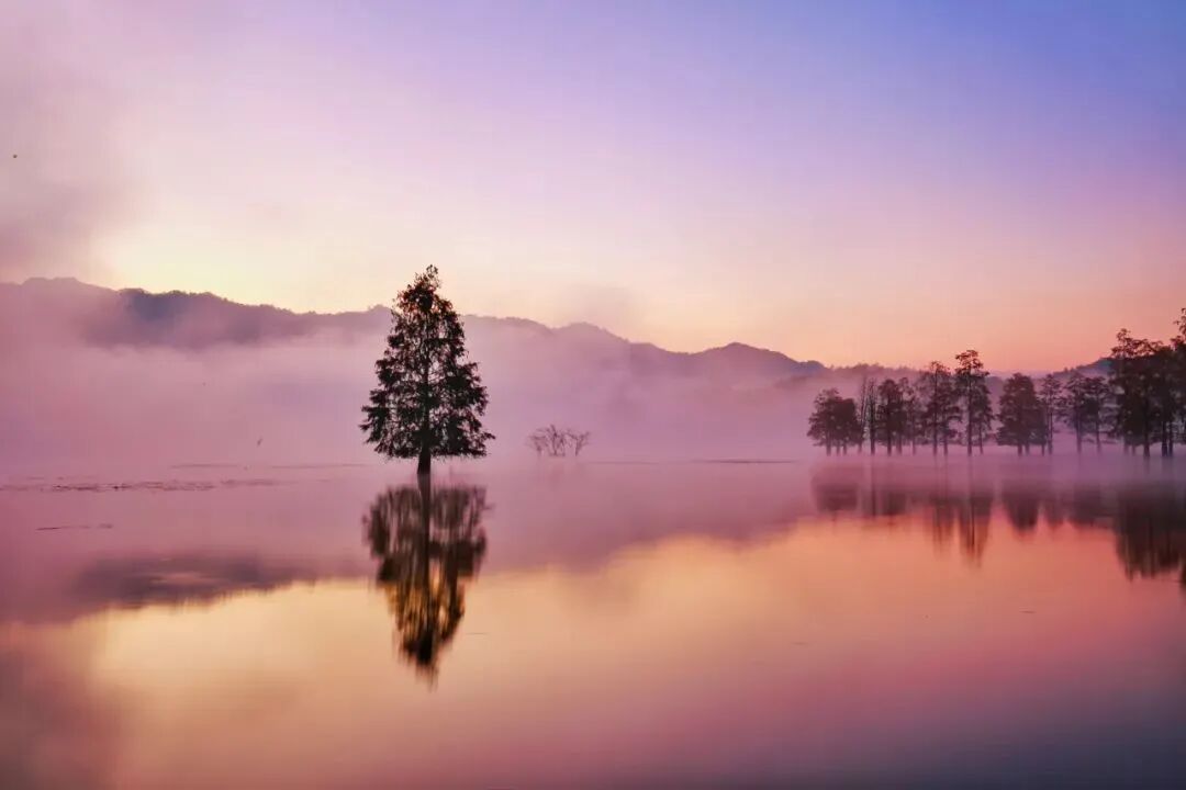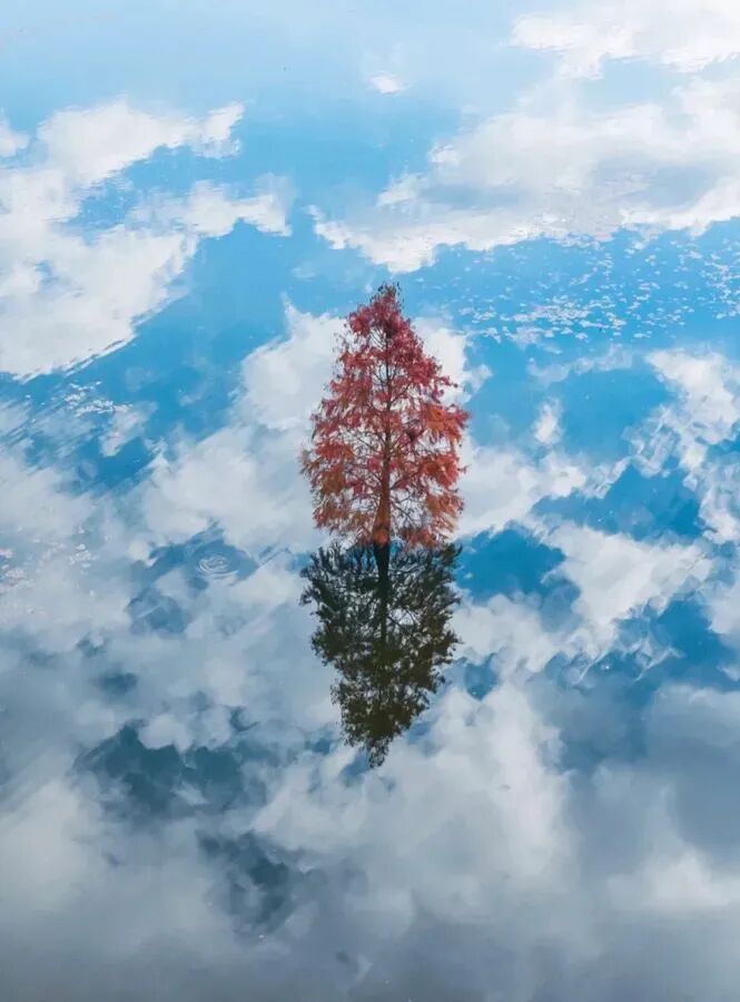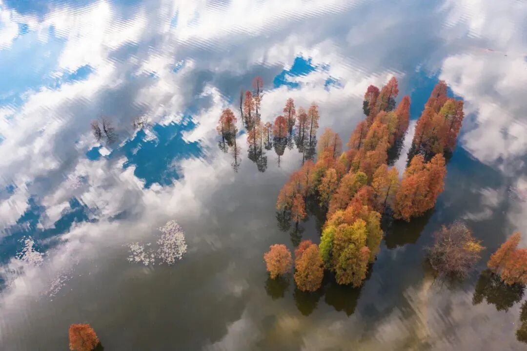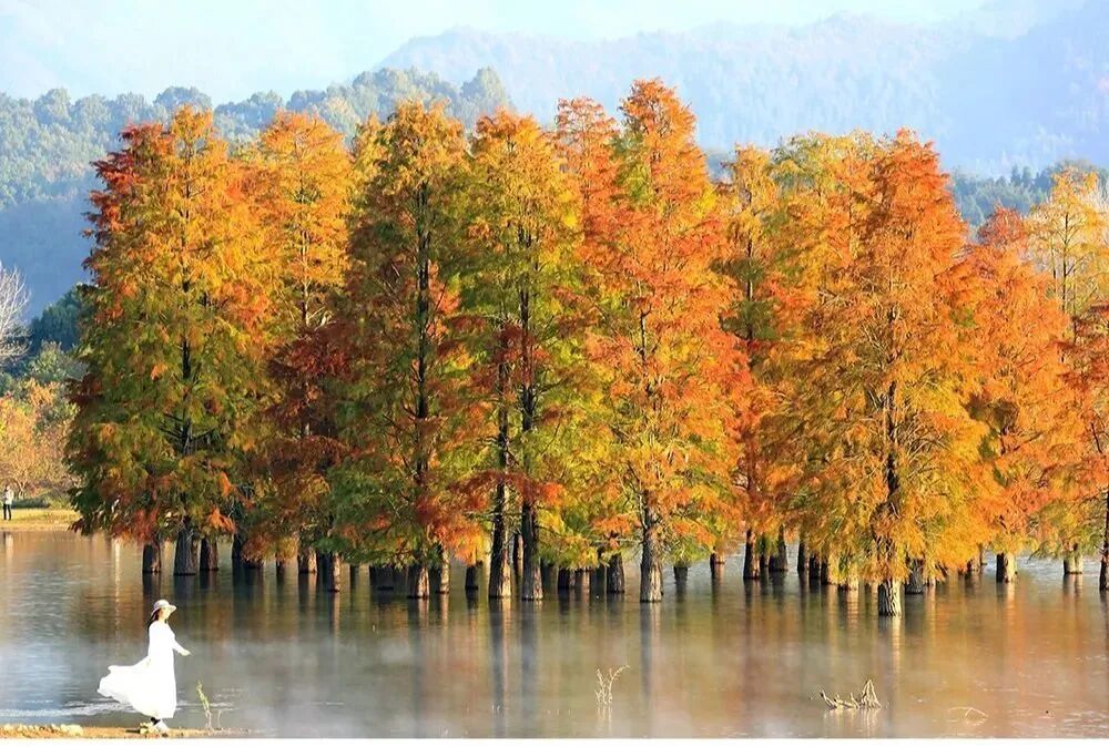如果你有无人机,可以打卡新西兰同款「最孤独的树」。倒影中的云雾和独自染红的水杉,多么美丽动人。