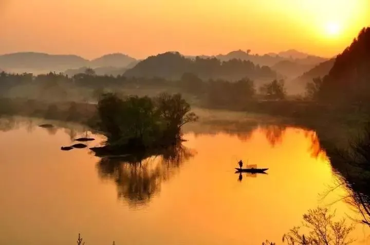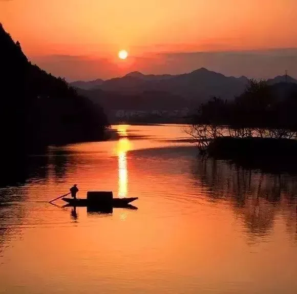 夕阳西下,余辉尽洒江面,一叶扁舟荡漾水面,岁月静好,甘愿沉沦。