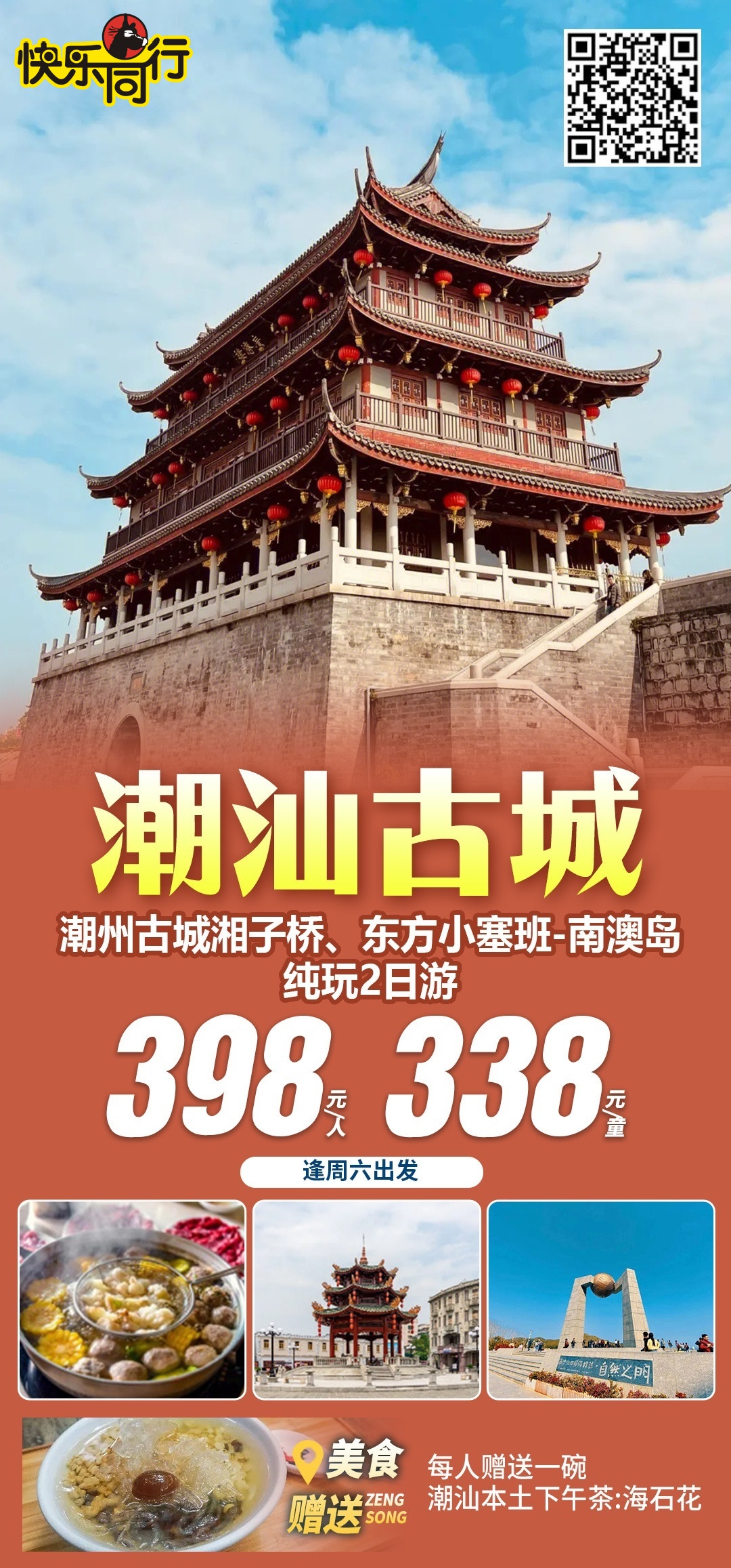 后游潮州古城:近观中国四大古桥、世界第一座启闭式桥梁、与洛阳桥、赵州桥、卢沟桥并列为中国四大古桥的【广济桥】(湘子桥),观赏韩江风光及修复一新的宋明代古城墙及广济城楼,漫步滨江文化长廊,观全国规模最大的滨江古城,“广济门”、“上水门”、“下水门”等城楼点缀其间,青山、绿水、古城、苍榕交相辉映,构成一幅绝妙的“山外青山楼外楼”的古城图;走街串巷于潮州的古民居【甲第巷】,观全国规模最大,种类最齐全的牌坊群—【牌坊街】。寻觅美食。