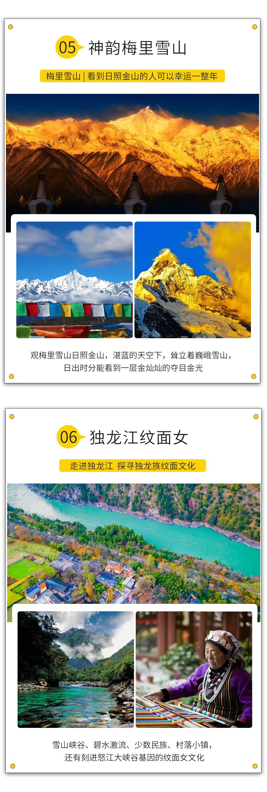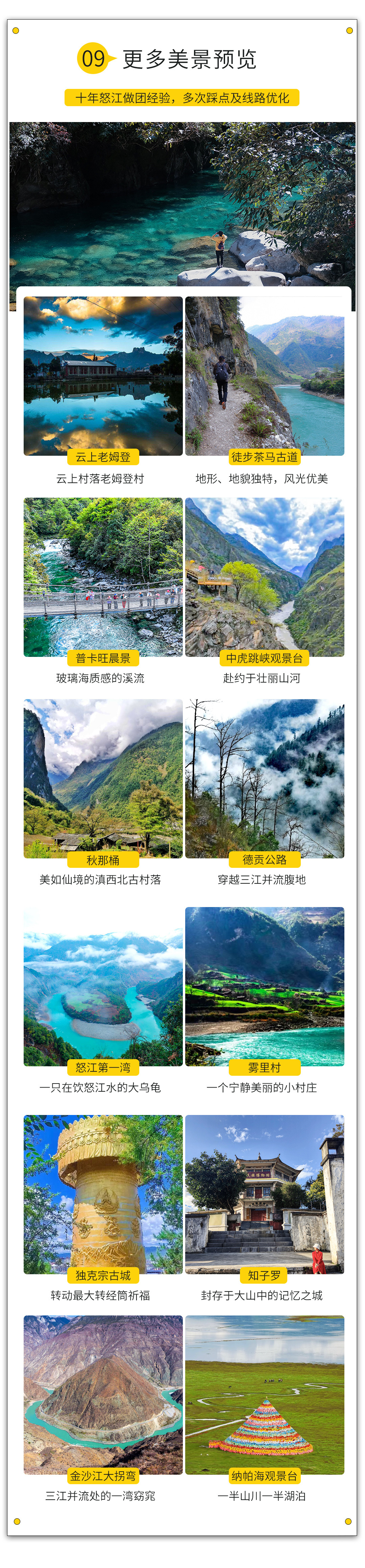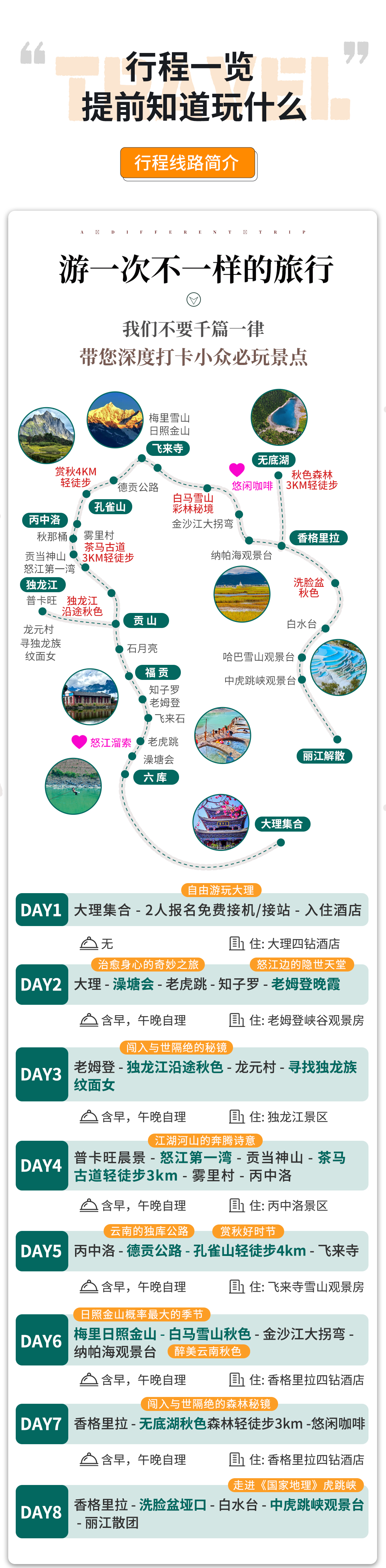 4.如独龙江天气或者政策性原因不能进入,则独龙江更改为:普达措森林公园+小中甸,行程对应调整为:D3:老姆登—丙中洛,住:丙中洛 D4:丙中洛—飞来寺,住:飞来寺 D5:飞来寺-香格里拉,香格里拉 D6:普达措森林公园+小中甸,住香格里拉 D7- D8后续行程不变,请知悉!