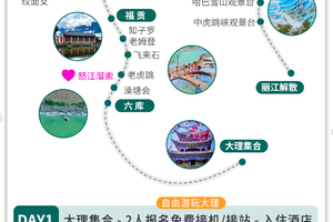 备注:报价包含大理接站和丽江送站一趟,全程师傅带队,不含单房差,全程单房差880元。 | |