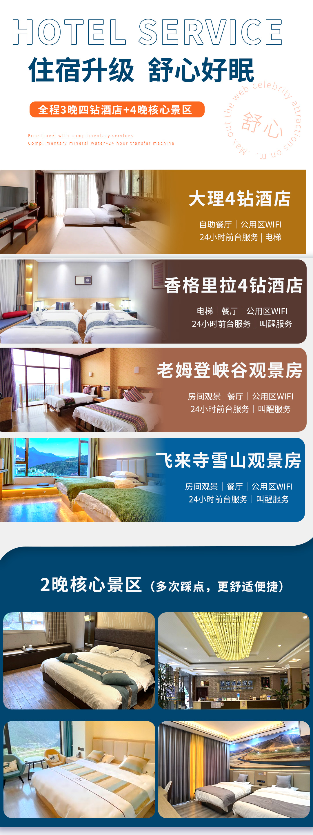 3、住宿:全程7晚住宿(3晚四钻酒店+1晚峡谷观景房+1晚雪山观景房+2晚核心景区:大理四钻酒店、老姆登峡谷观景房、独龙江景区标间、丙中洛景区标间、飞来寺雪山观景房、香格里拉四钻酒店)
