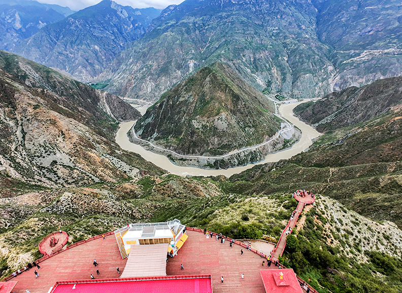 随后驱车前往【金沙江大拐弯】金沙江大拐弯也叫做月亮湾,携三江之水投入了金沙江的怀抱,在江水汇合处,形成“三壁夹两江”的奇景。穿山越谷而来的金沙江,在即将冲出这川滇要塞之时,放慢脚步,围绕着金字塔般的日锥凤潇洒地画上了一个“U”字形的大拐弯。