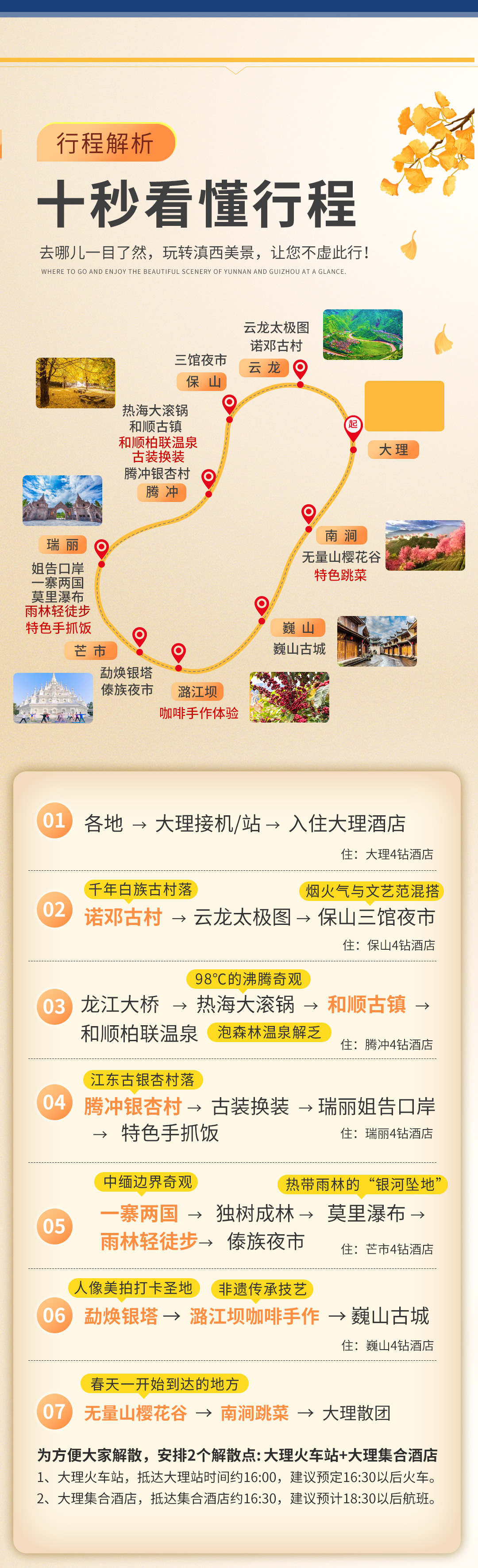 1、回程我们有2个解散点,先到大理火车站,再到大理集合酒店,团友可以根据时间灵活选择散团地。