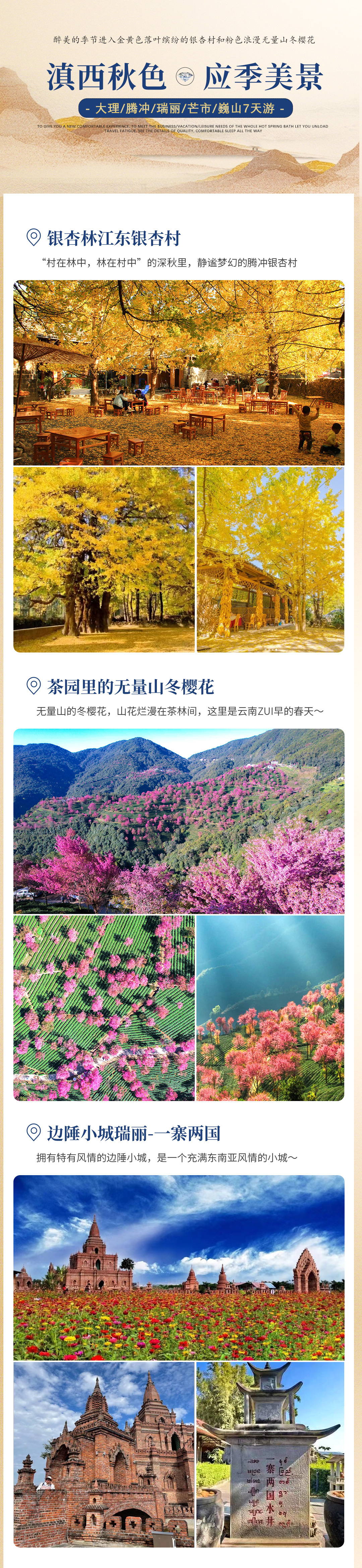 【网红打卡】银杏林江东银杏村+茶园里的无量山冬樱花+边陲小城瑞丽+傣乡风情芒市+侨乡和顺古镇+和顺柏联SPA温泉+千年古盐村诺邓古村+南诏古国巍山古城