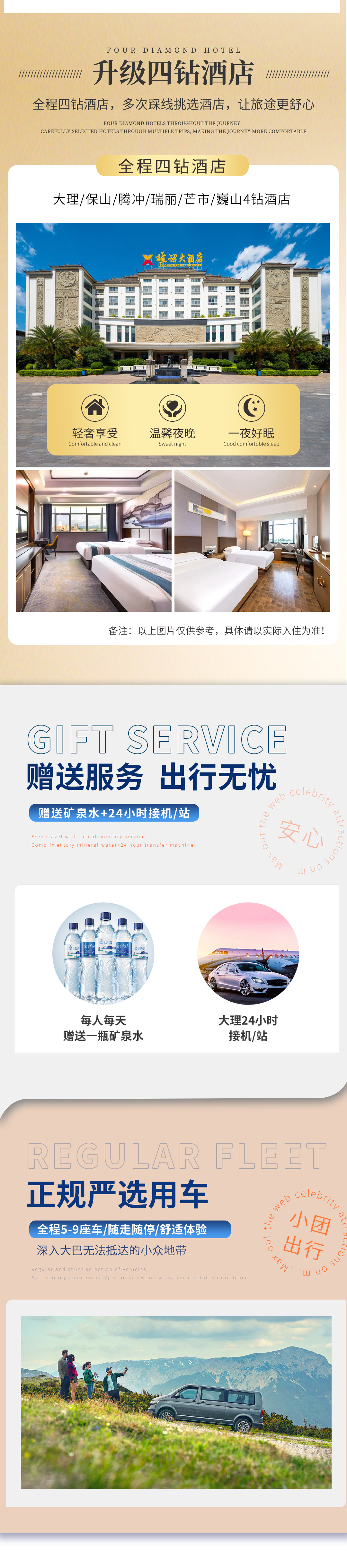 3、住宿:全程6晚四钻酒店(大理四钻酒店、保山四钻酒店、腾冲四钻酒店、瑞丽四钻酒店、芒市四钻酒店、巍山四钻酒店)