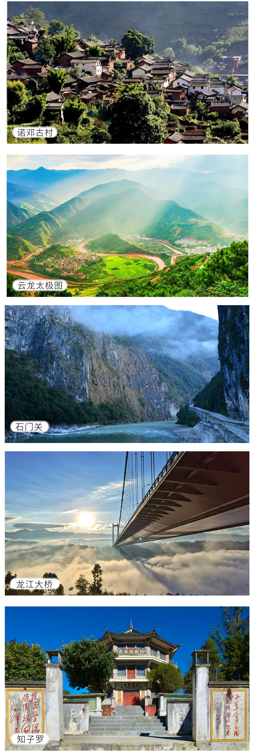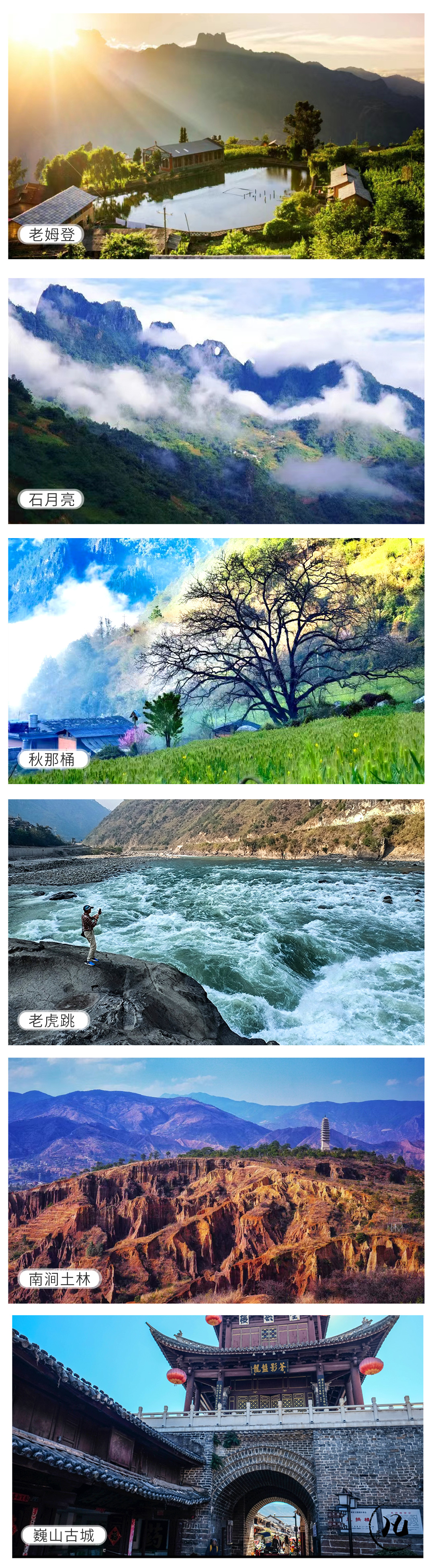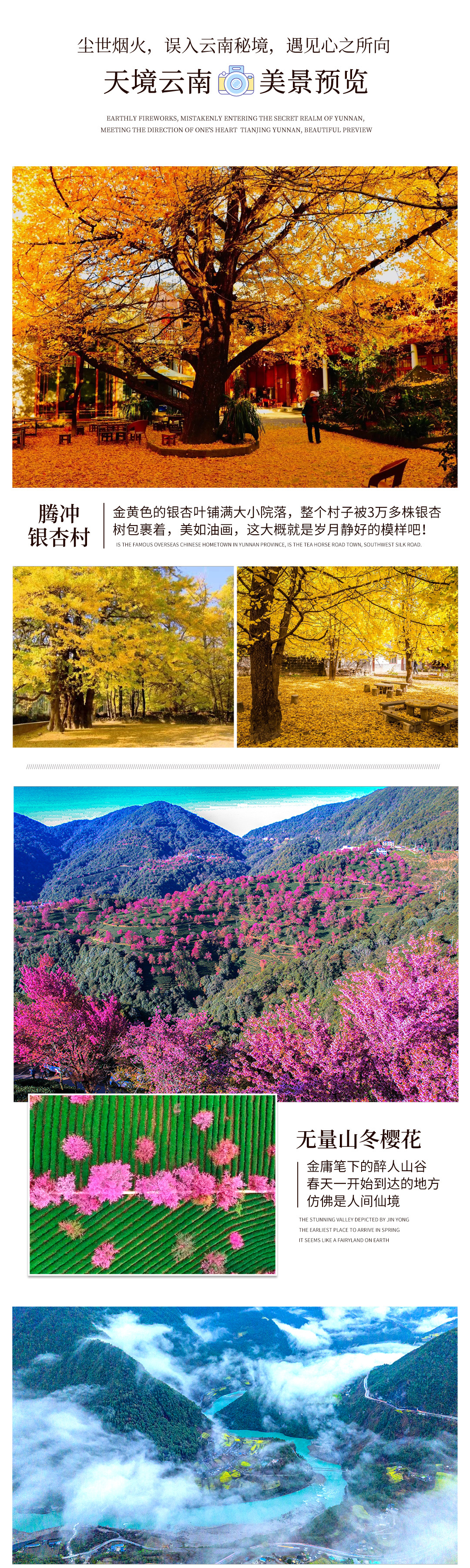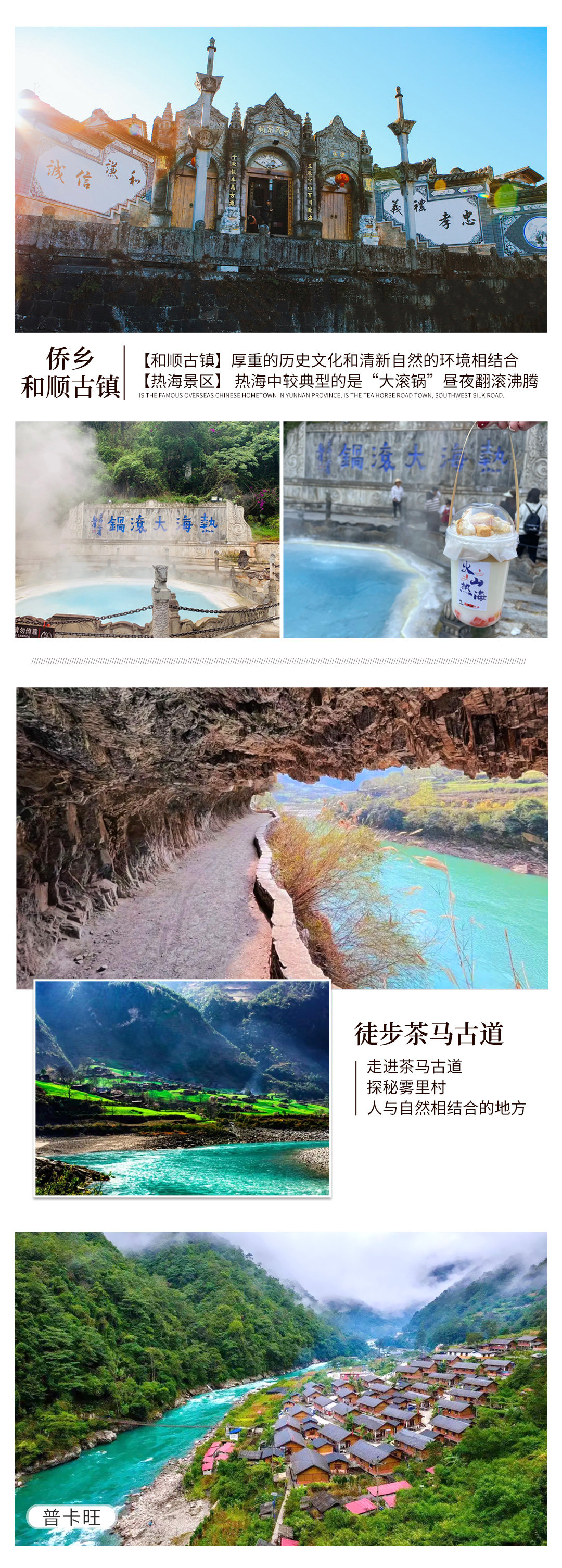 2、景点:怒江大峡谷、丙中洛、秘境独龙江、老姆登、腾冲银杏村、热海公园、和顺古镇、柏联温泉(赠送)、诺邓古村、云龙太极图、无量山冬樱花、南涧土林、巍山古城