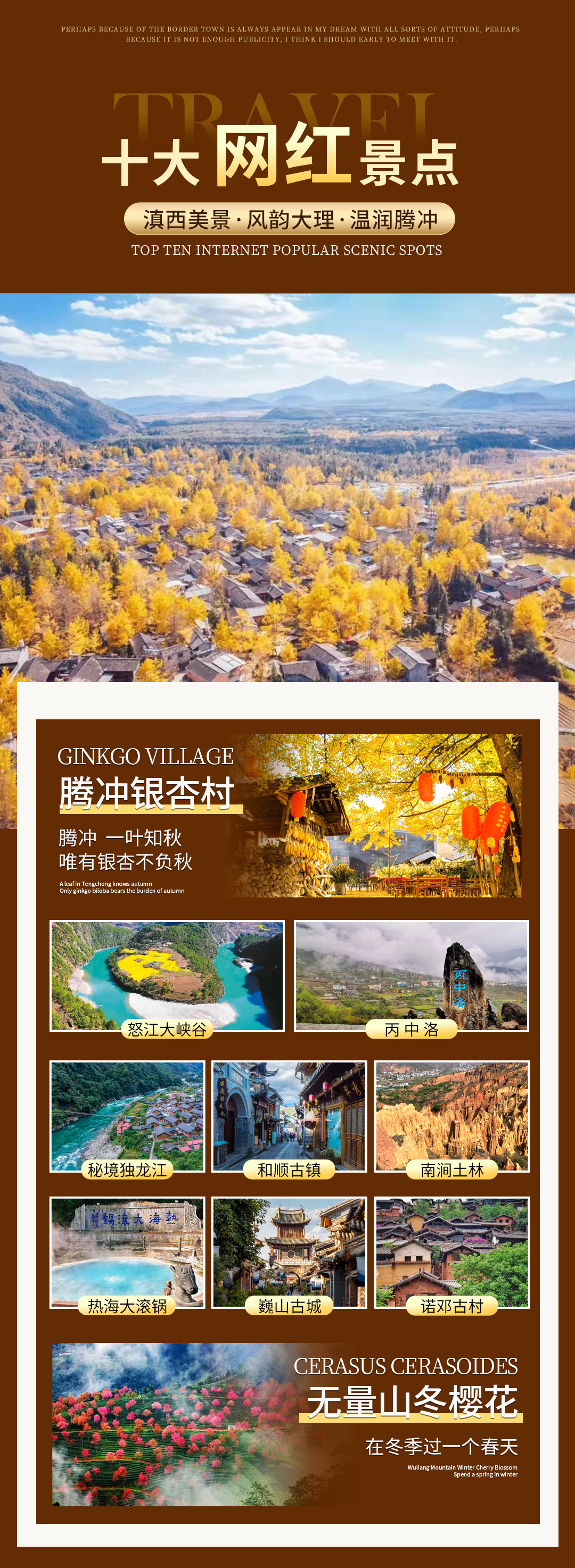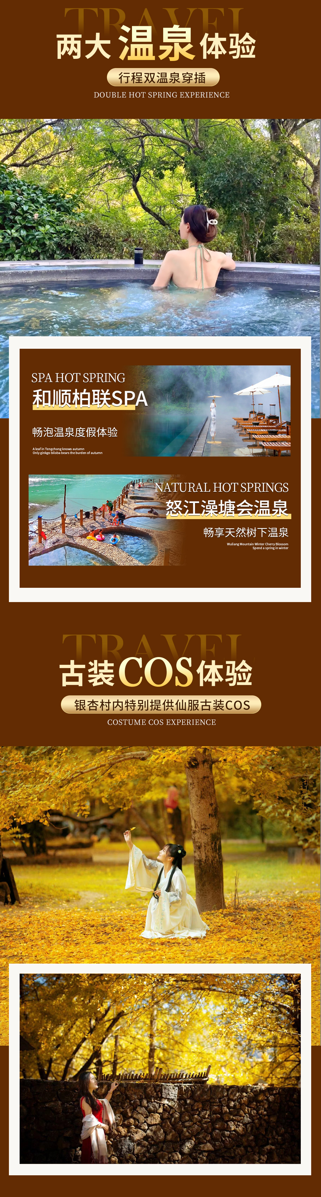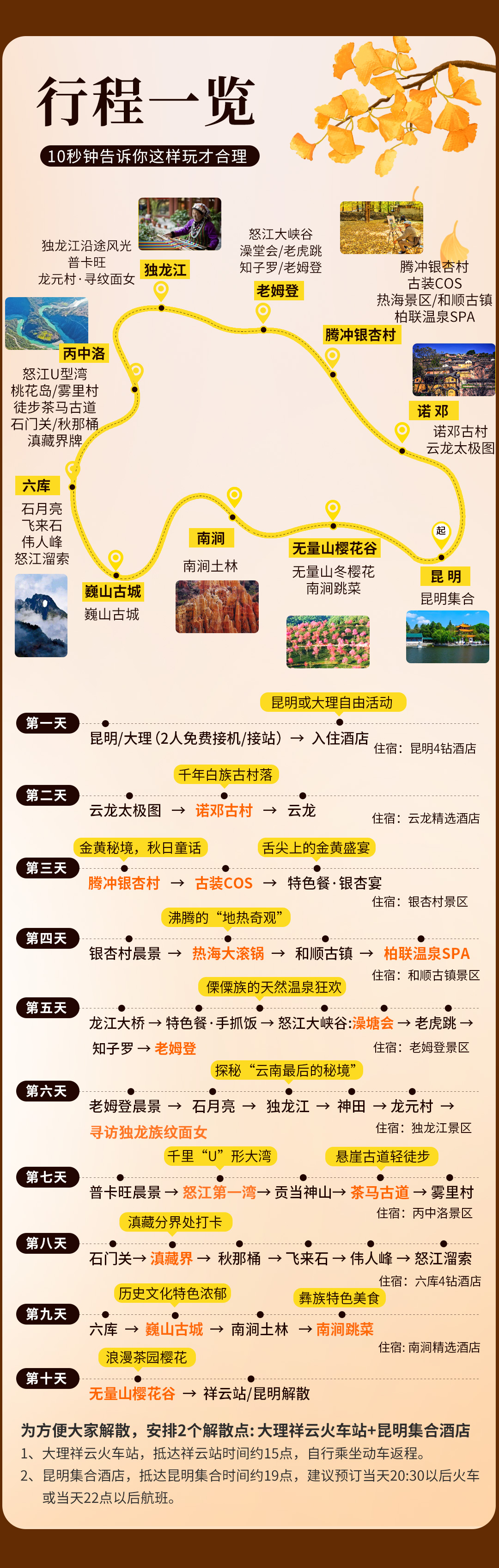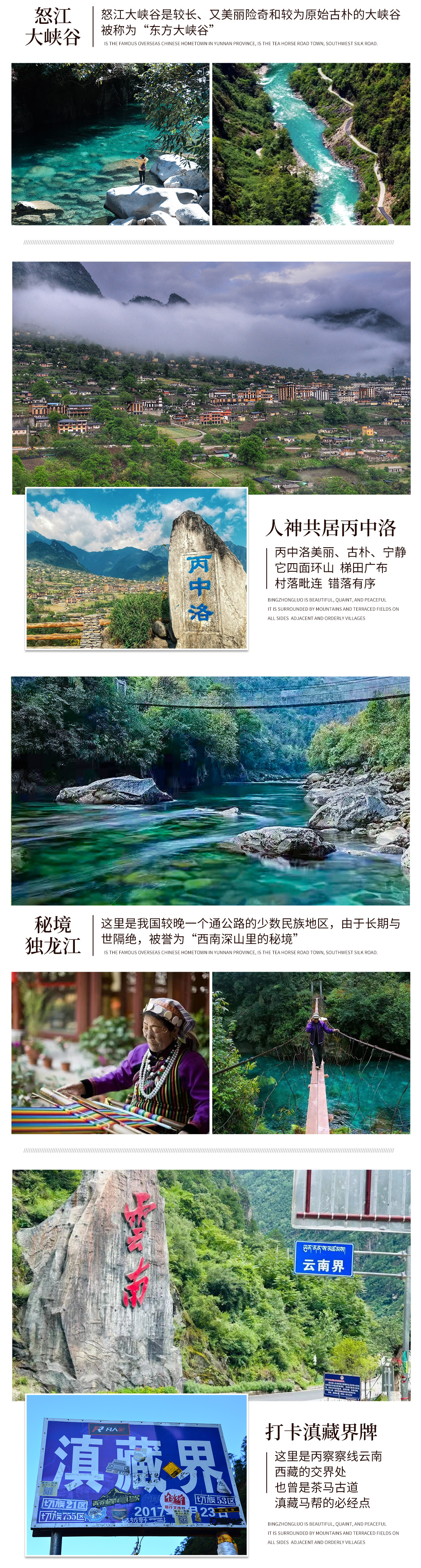 2、景点:怒江大峡谷、丙中洛、秘境独龙江、老姆登、腾冲银杏村、热海公园、和顺古镇、柏联温泉(赠送)、诺邓古村、云龙太极图、无量山冬樱花、南涧土林、巍山古城