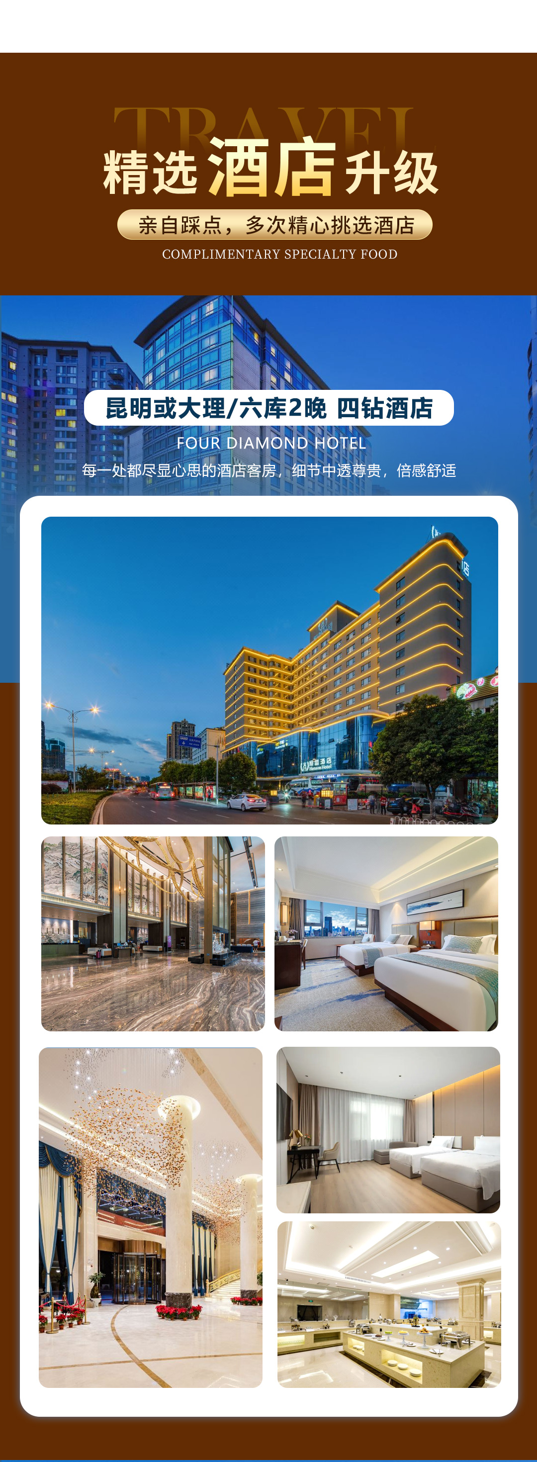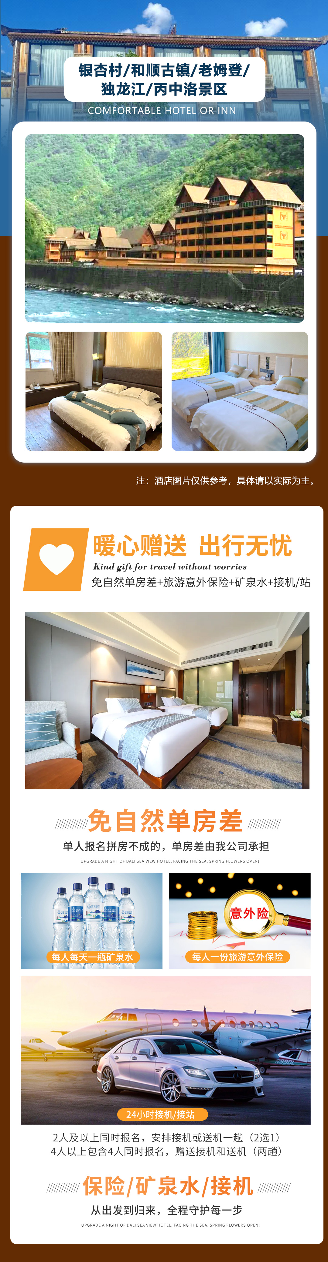 3、住宿:全程9晚住宿(2晚四钻酒店+5晚景区住宿+2晚优选酒店){昆明四钻酒店、云龙优选酒店、银杏村景区客栈、和顺古镇景区客栈、老姆登景区酒店或客栈、独龙江景区酒店或客栈、丙中洛景区酒店或客栈、六库四钻酒店、南涧优选酒店}
