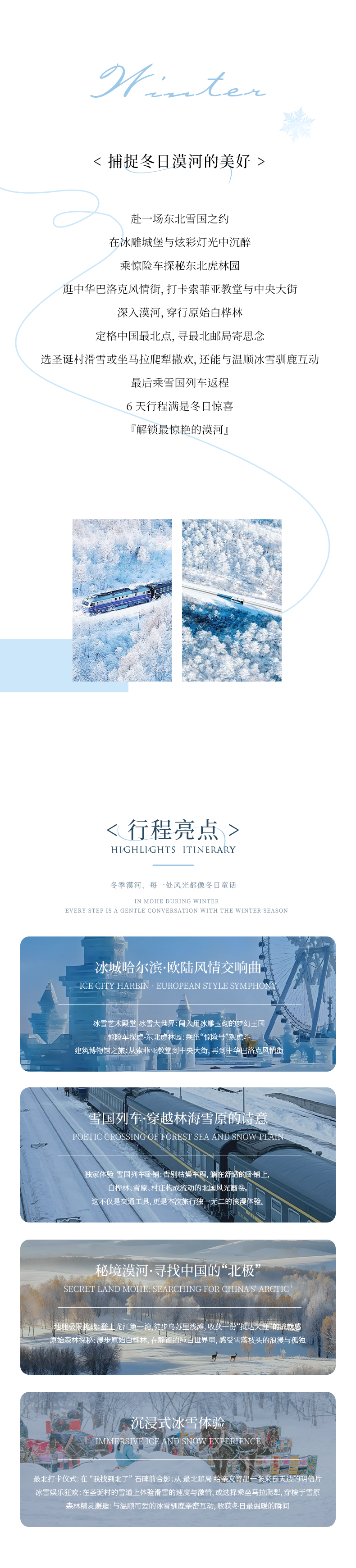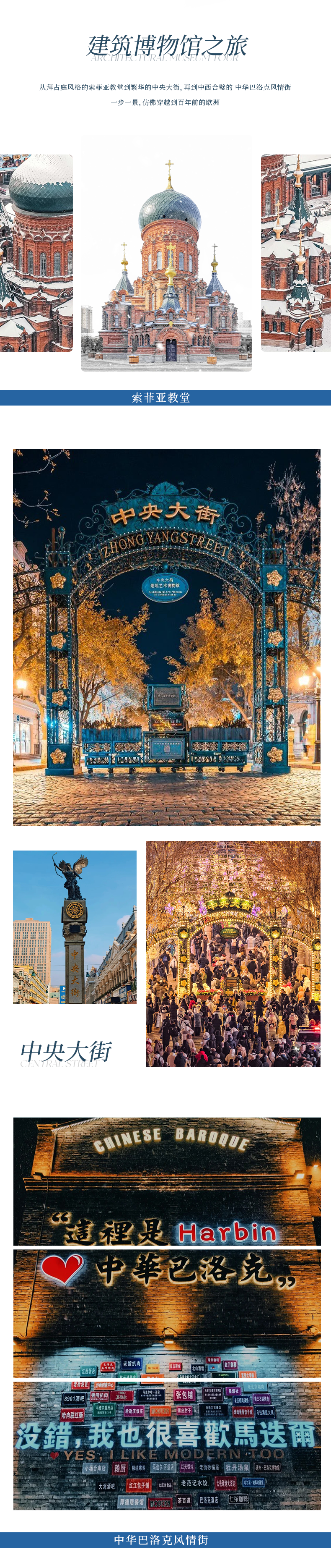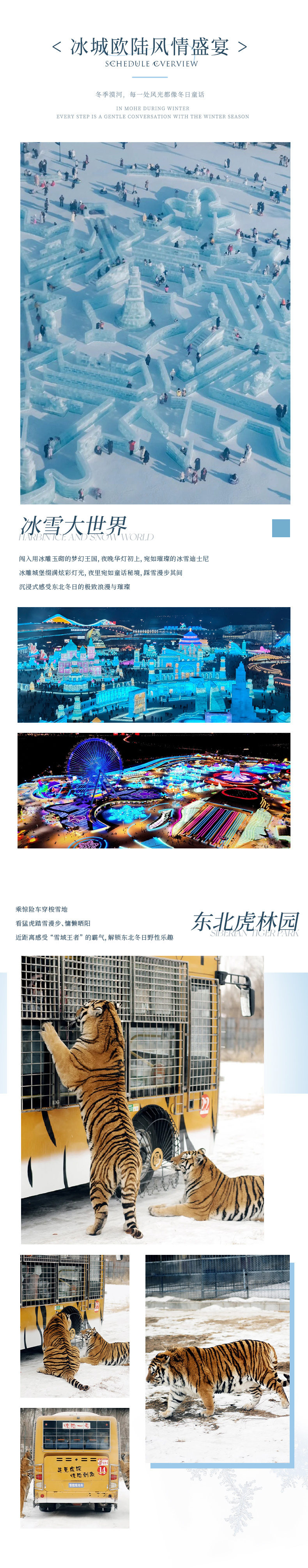 门票 | 冰雪大世界首道门票(12.19日前报名团费不含此门票,行程调整百年铁路桥打卡+防洪纪念塔,12.20日以后报名团费包含门票) 东北虎林园门票+惊险车 龙江第一湾+乌苏里浅滩门票 北极村门票 圣诞村门票 |