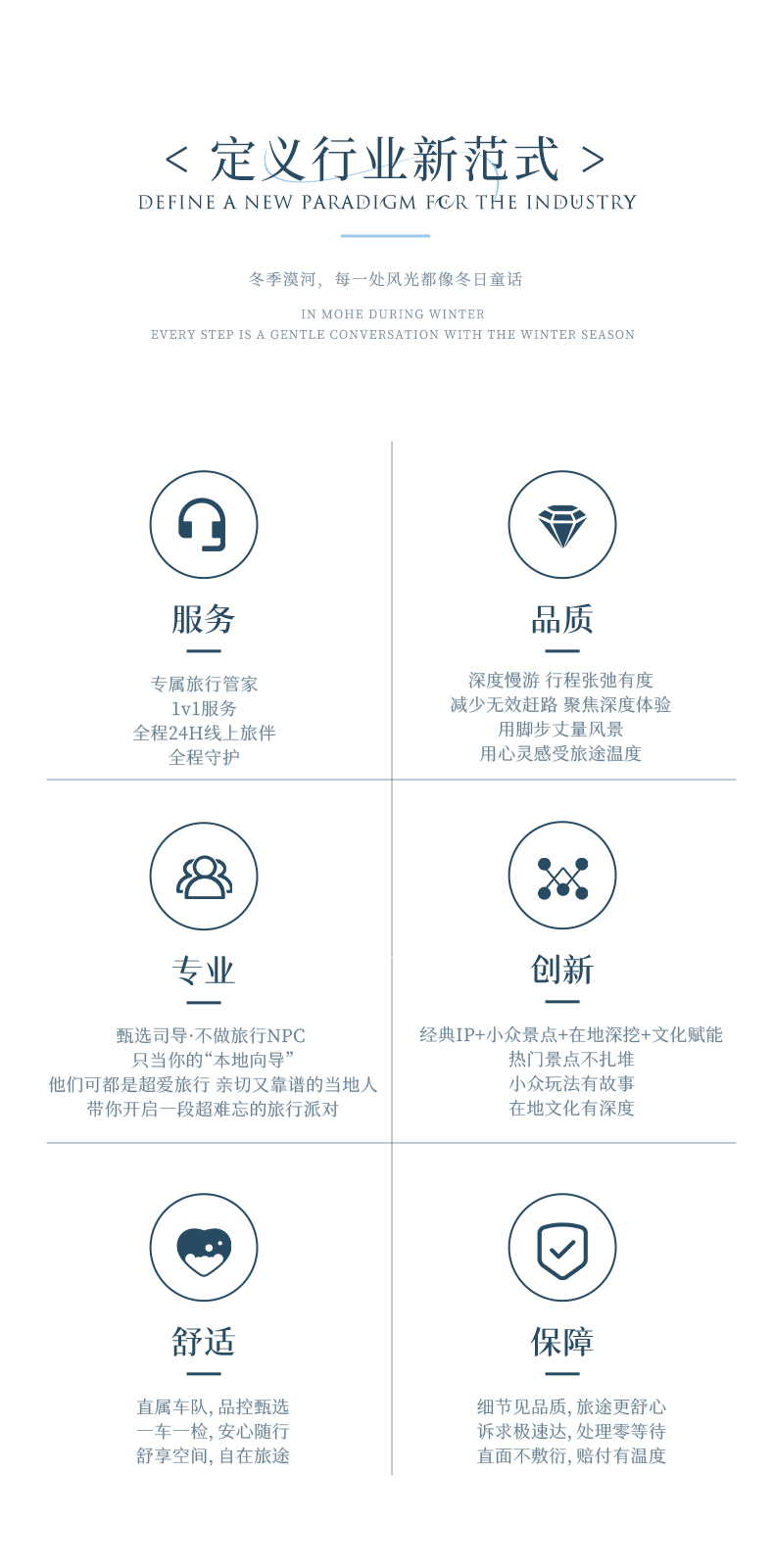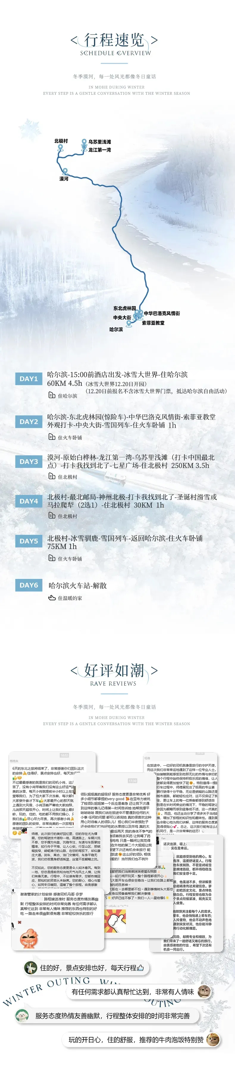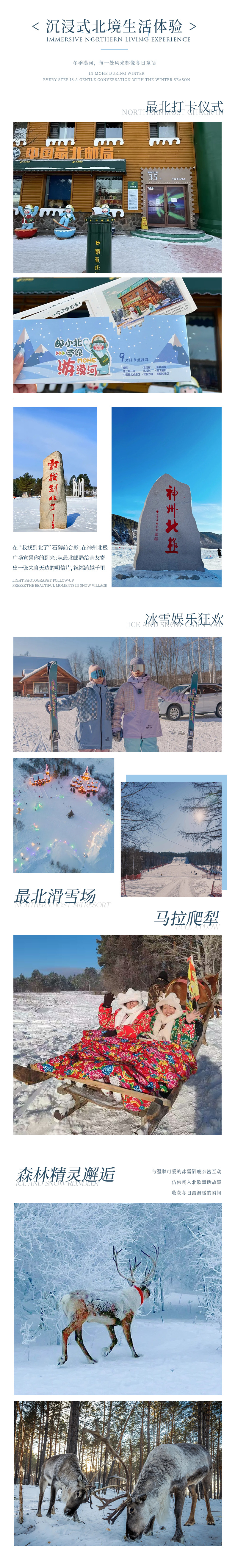赠送 | 1.接送机说明: 散拼小团: D1哈尔滨接机(机场等位30分钟)需要购买13:00多抵达机场的机票,D6哈尔滨火车散团(如需提供火车站-机场包车接/送机季务,需要额外增加费用,5座车150台,7座车200/台(不指定车型) 私家小团: 24小时接送机服务(不指定车型) 30万元旅游意外险 北极村景区门口定点无人机团体航拍一段+每人单返拍照电子照片6张,如景区无人机进行管制禁飞,则航拍项目自动取消 极光限定,来自最北端寄出的一封慢信, (一张明信片+1个信封+1张邮片) 品尝东北本土冻果 6.最北篝火景区根据当地天气及客流量安排此项目) 7.43°北极村体验雪地秧歌+雪地蹦野迪(景区根据当天天气及客流量随机调整安排活动) 8.驯鹿门票 |