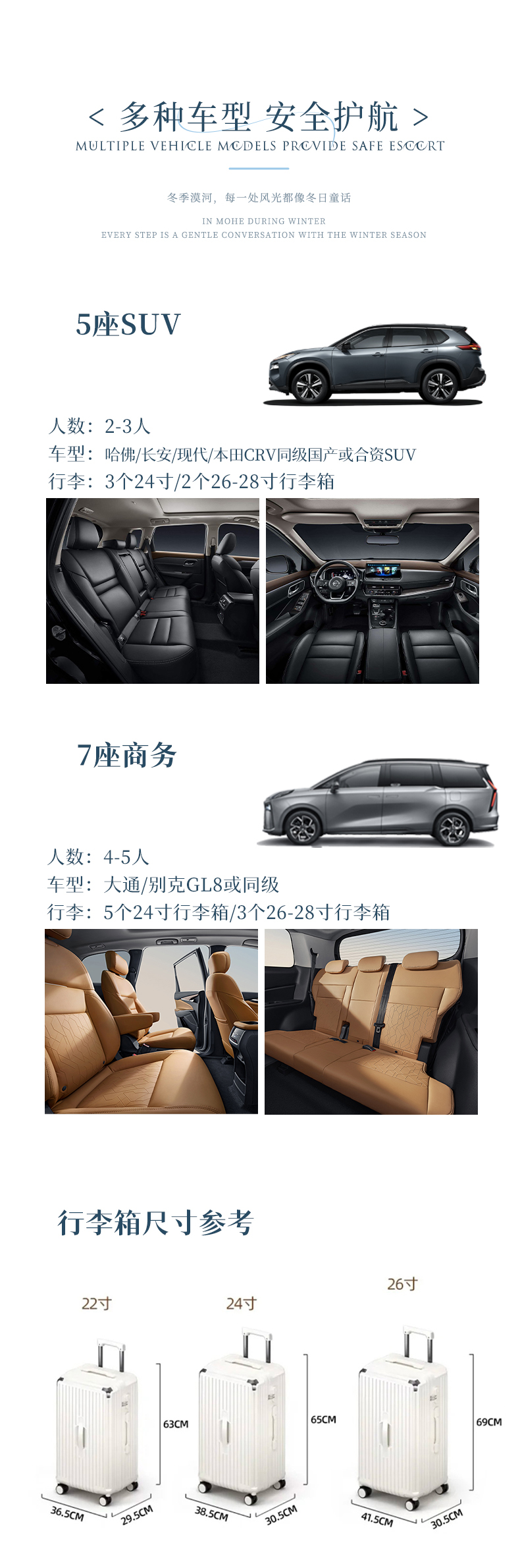 用车 | 根据出行人数选择相对应车型,2-3人5座SUV、4-5人7座商务车,6-7人9座商务车,8人以上15-18座商务车,每人限携带一个24寸以内行李箱,如有行李不符问题请提前咨询 |