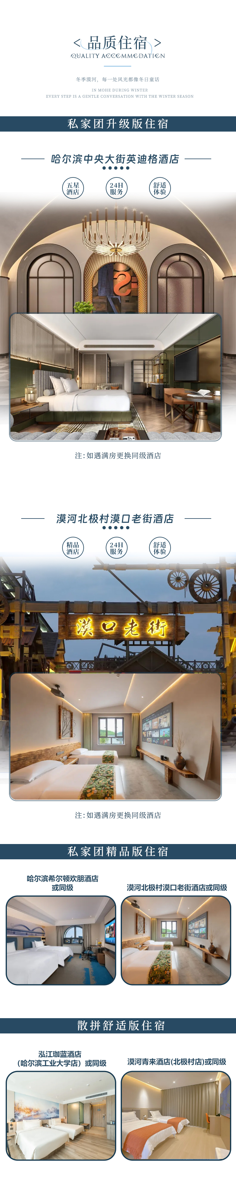 第一晚:哈尔滨希尔顿欢朋/希尔顿惠庭/丽呈东谷酒店/中央大街希岸Deluxe/万枫酒店/慕斯健康或同级 第二晚:火车硬卧(随机出票) 第三晚:北极村漠口老街酒店/翅翼温泉酒店/索金大酒店 第四晚:北极村漠口老街酒店/翅翼温泉酒店/索金大酒店 第五晚:火车硬卧(随机出票) | |
